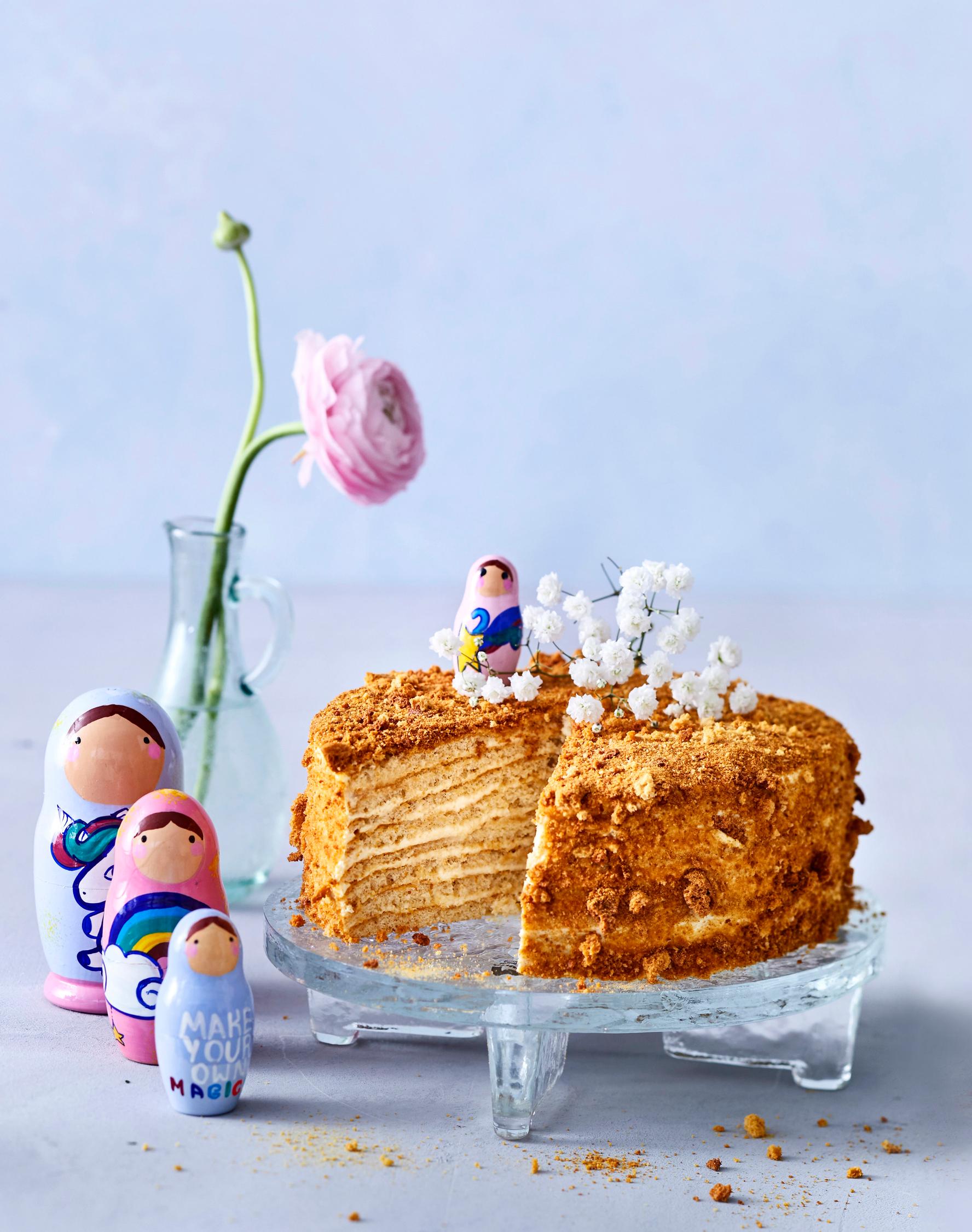Venäläinen monikerroksinen hunajakakku on upea ilmestys. Kakku on makea, mutta omena- ja sitruunamehu taittavat liian makeuden sopivasti.