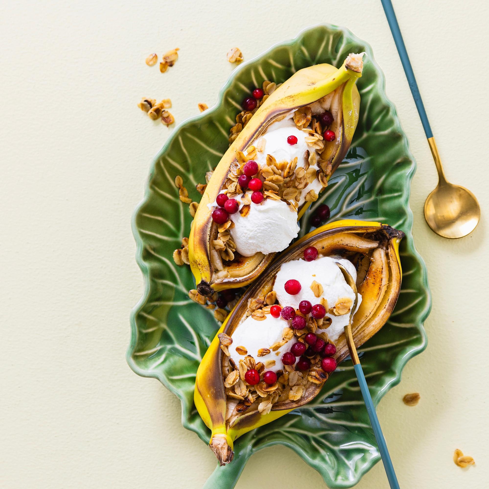 Karamellisoi banaanin pinta sokerilla crème brûléen tapaan. Kauho päälle paksua jogurttia ja viimeistele rapeaksi paahdetuilla hunajakaurahiutaleilla ja raikkailla puolukoilla.