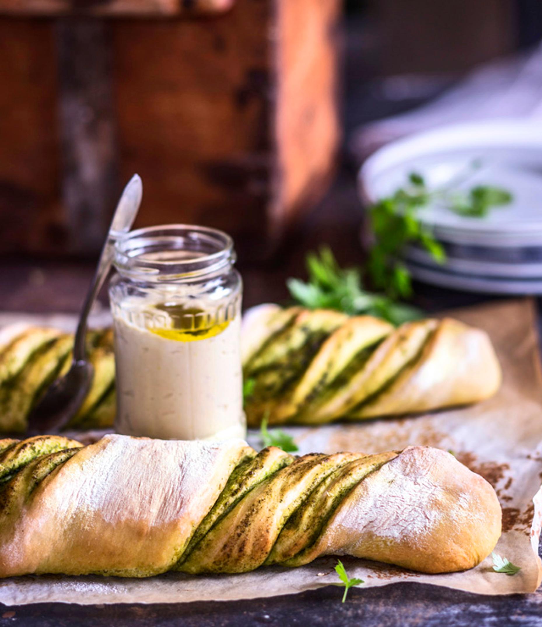 Korvapuusteista lainattu idea toimii myös leipätaikinassa. Sokeri vaihtuu yrtteihin ja kaneli valkosipuliin. Kiharat pysyvät ojennuksessa myös uunissa, kun taikinaan malttaa vaivata kunnon sitkon.