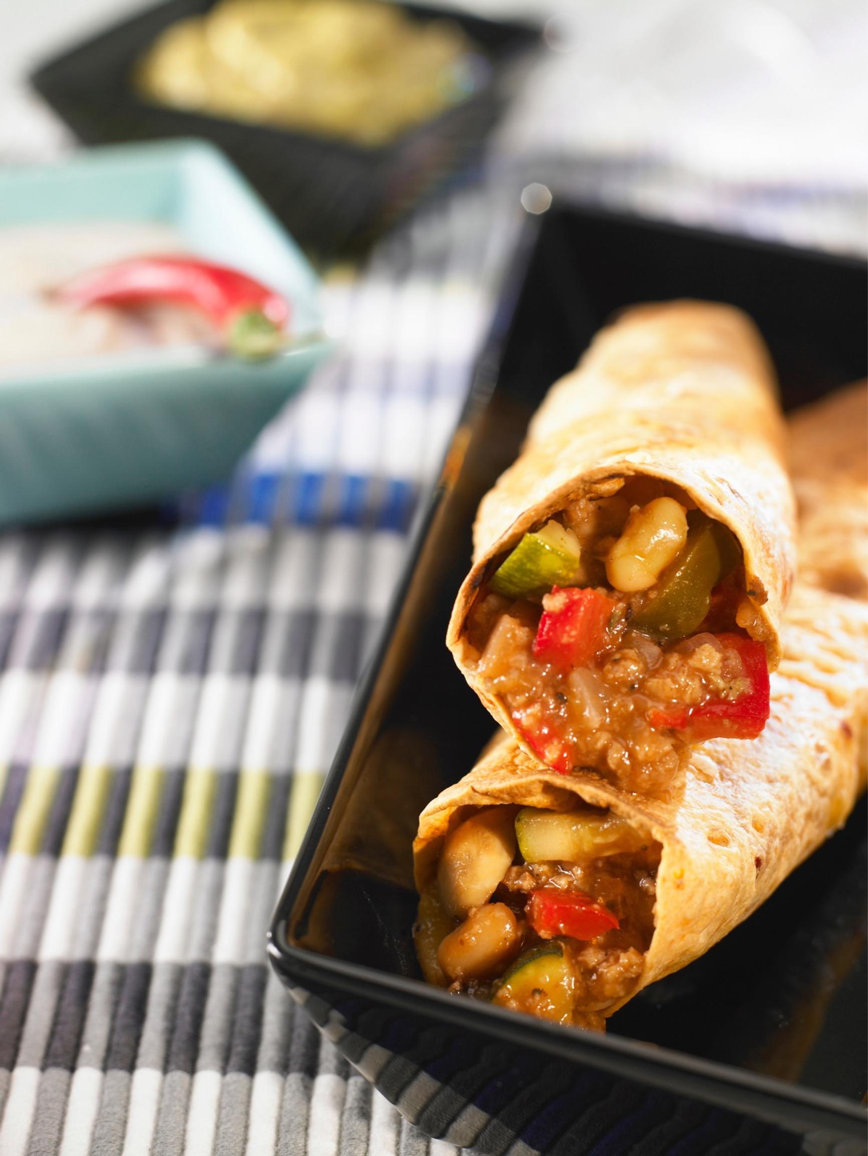Täytä tortillaletut ja kierrä rullalle uunivuokaan. Ripottele pinnalle juustoraastetta. Paista uunin keskitasolla 200 asteessa 5–10 minuuttia, kunnes juusto sulaa ja kasvistortillat ruskistuvat hieman.