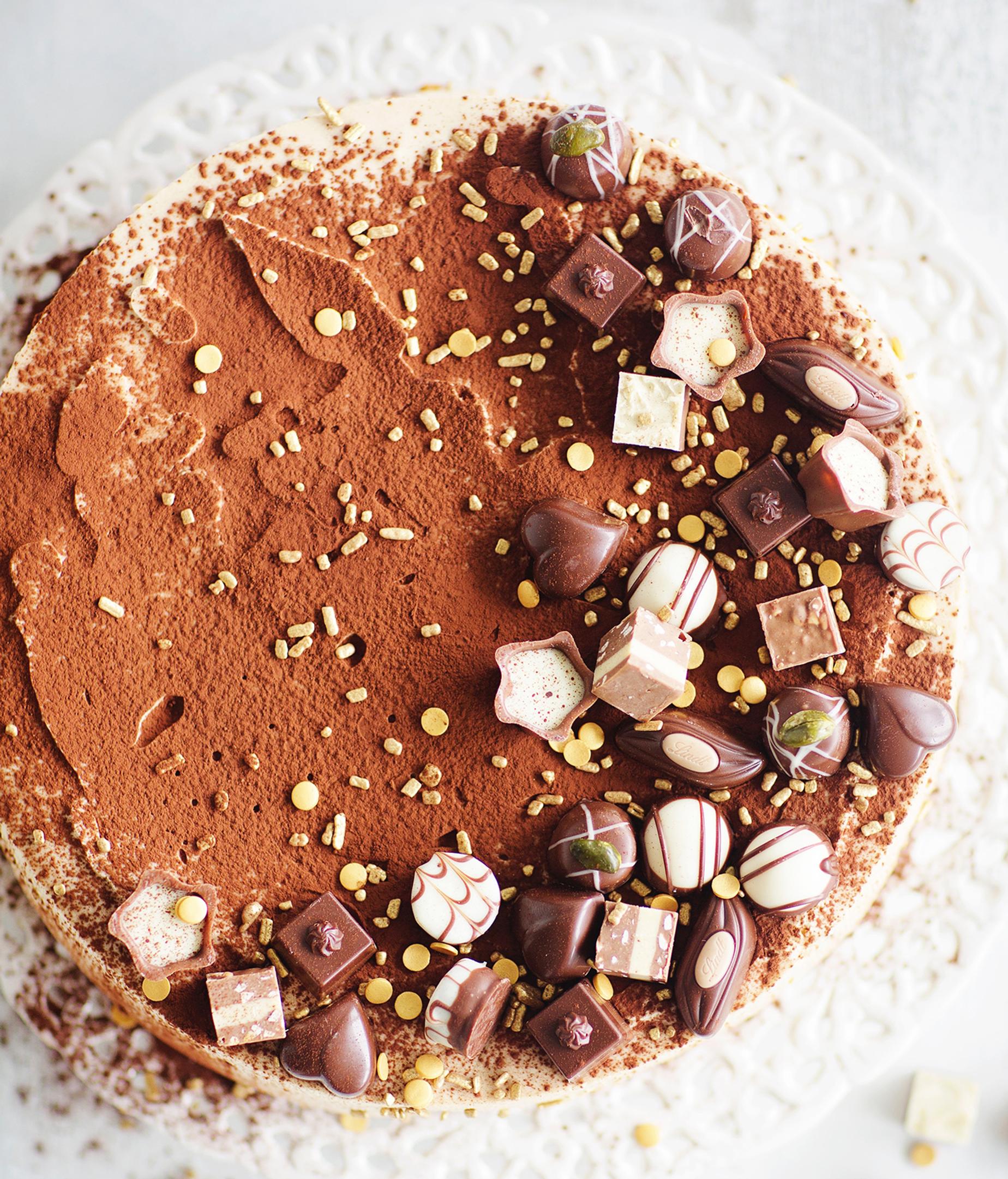 - Siivilöi pinnalle kaakaojauhetta. Koristele irish coffee -kakku suklaakonvehdeilla ja koristerakeilla.