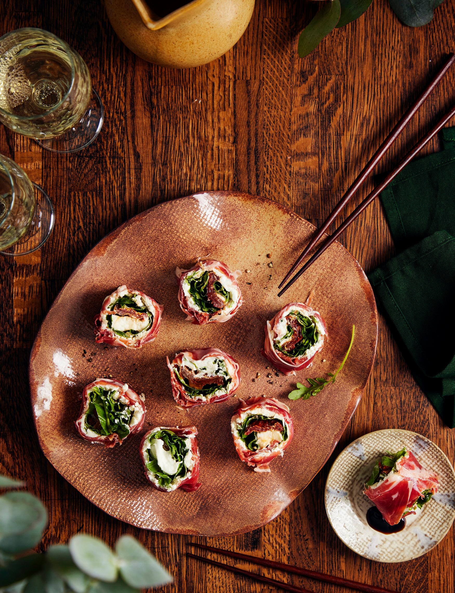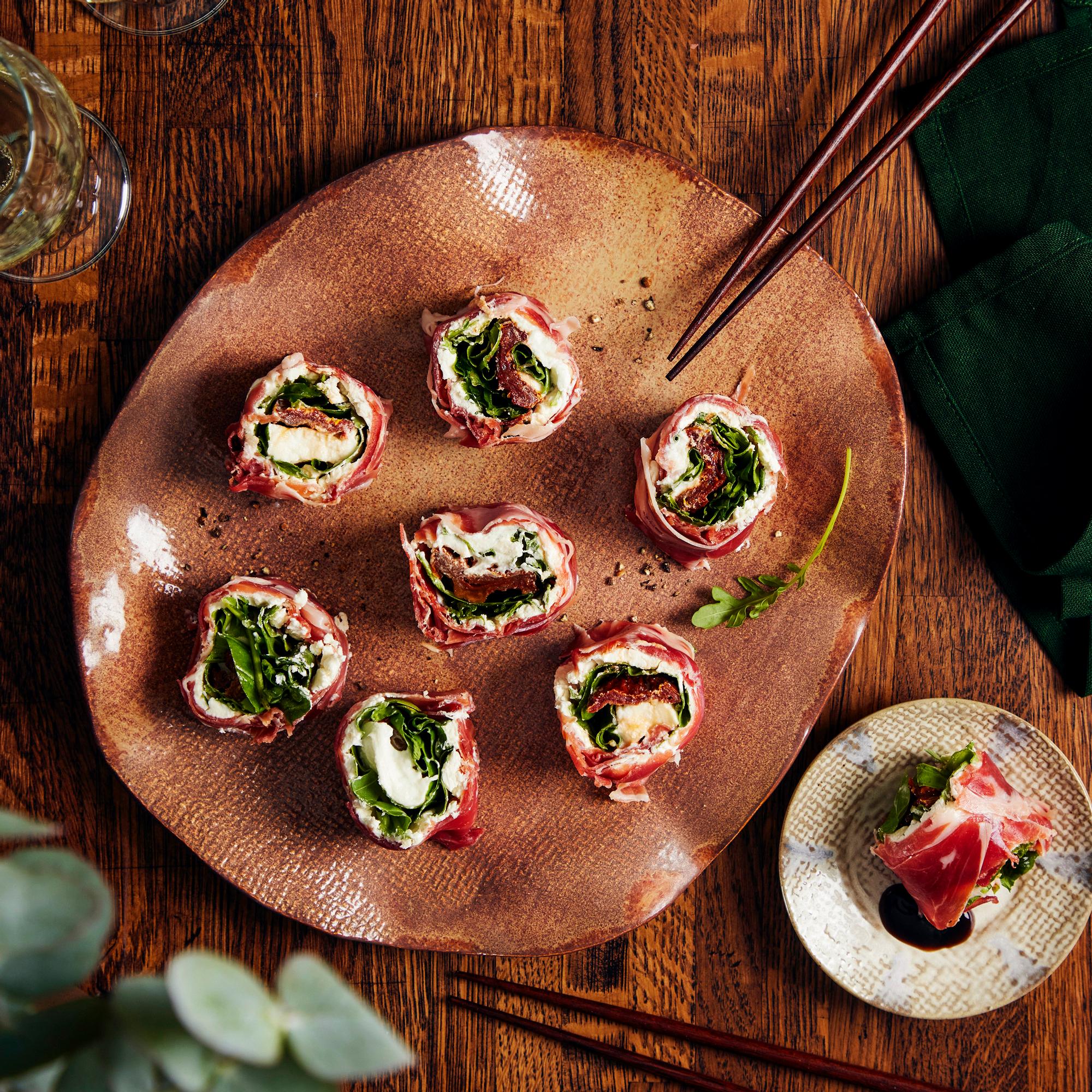 Italialainen ”sushi” hurmaa yksinkertaisuudellaan. Mozzarella, kinkku ja rucola kääritään ja leikataan paloiksi makisushin tapaan.