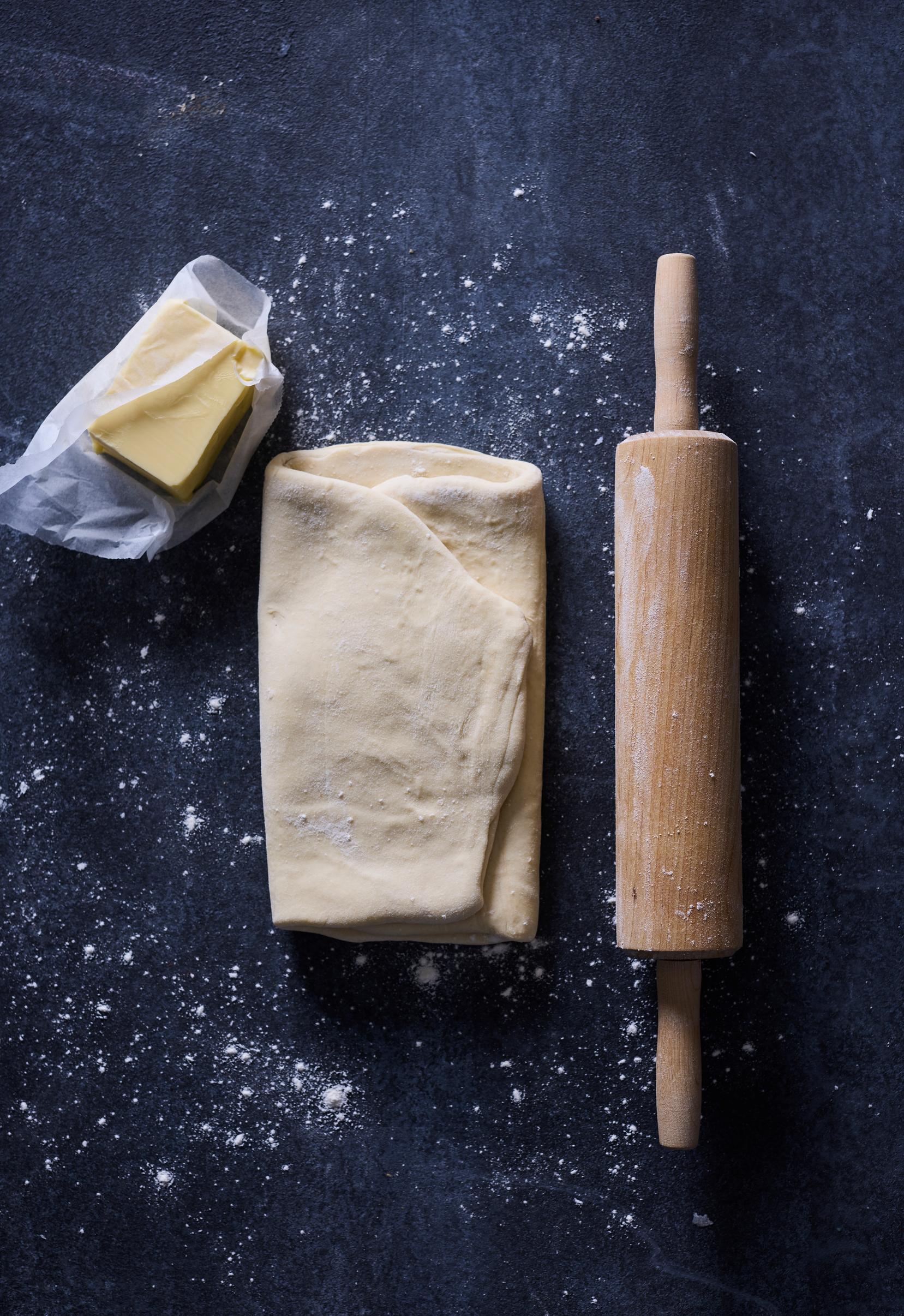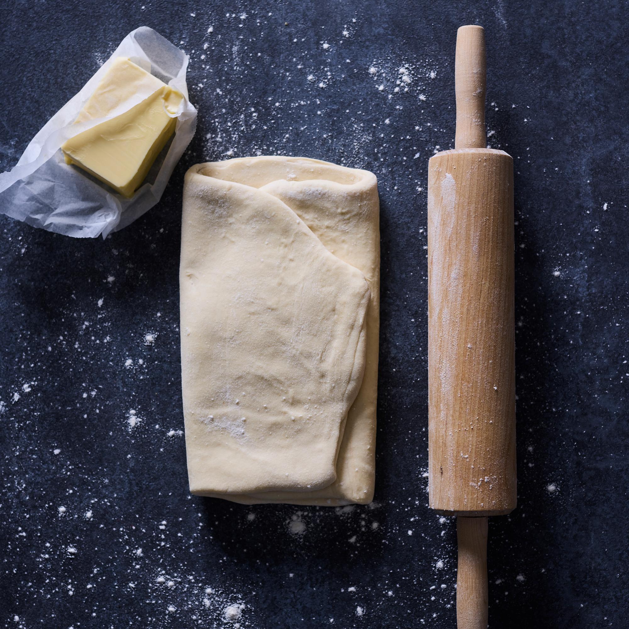 - Ripottele jauhoja taikinalevyn molemmille puolille. Painele taikinaa ensin kaulimella ja kauli sitten levyksi, jonka koko on noin 20 × 45 cm. Taittele taas kolmeen osaan neliöksi. Kauli vielä kerran levyksi, jonka koko on noin 30 × 30 cm, ja taita kolmeen osaan. Nosta taikina pakastimeen jäähtymään 20 minuutiksi.