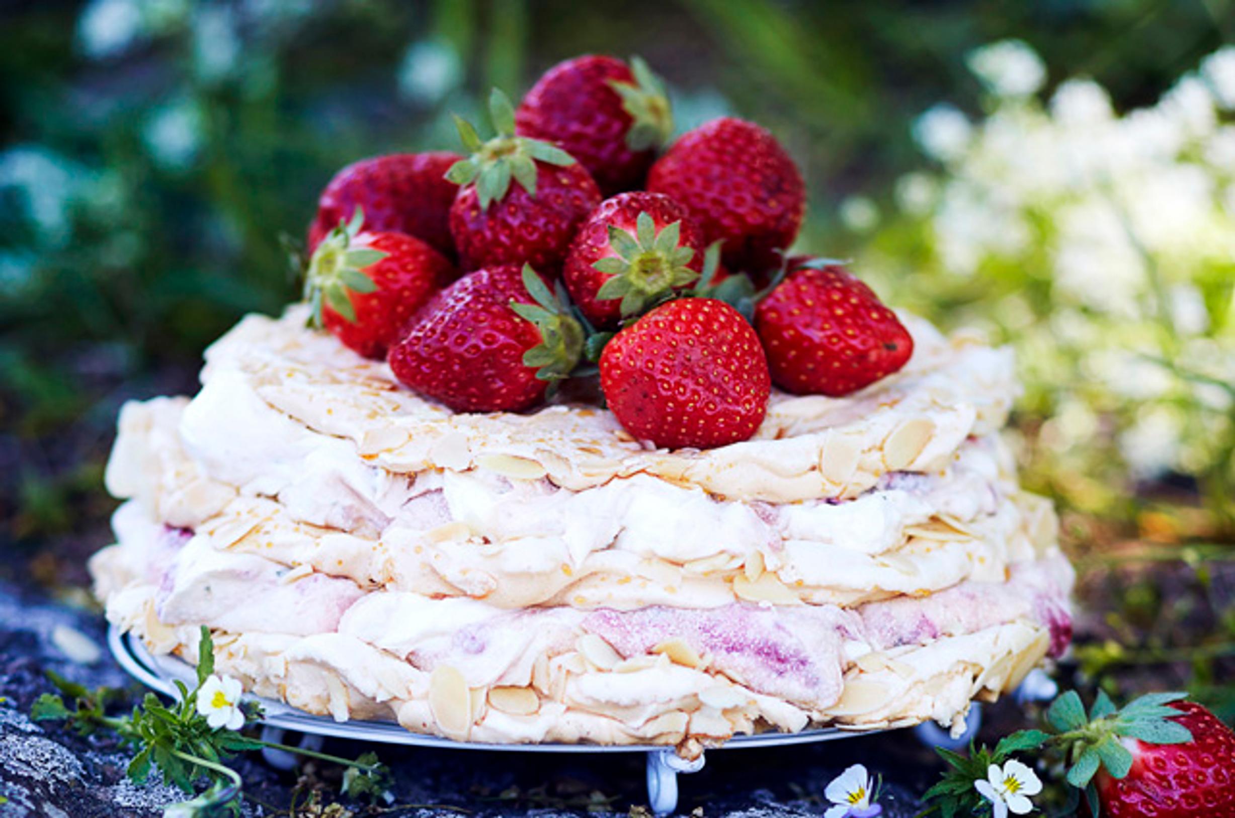 Tämä jäädytetty marenkikakku on ihana! Voit tehdä kakun jo juhlia edeltävänä päivänä. Jugurttitäyte sitoo itse tehdyt marenkilevyt yhteen. Näyttävässä kakussa maistuu marengin lisäksi mansikka ja minttu.