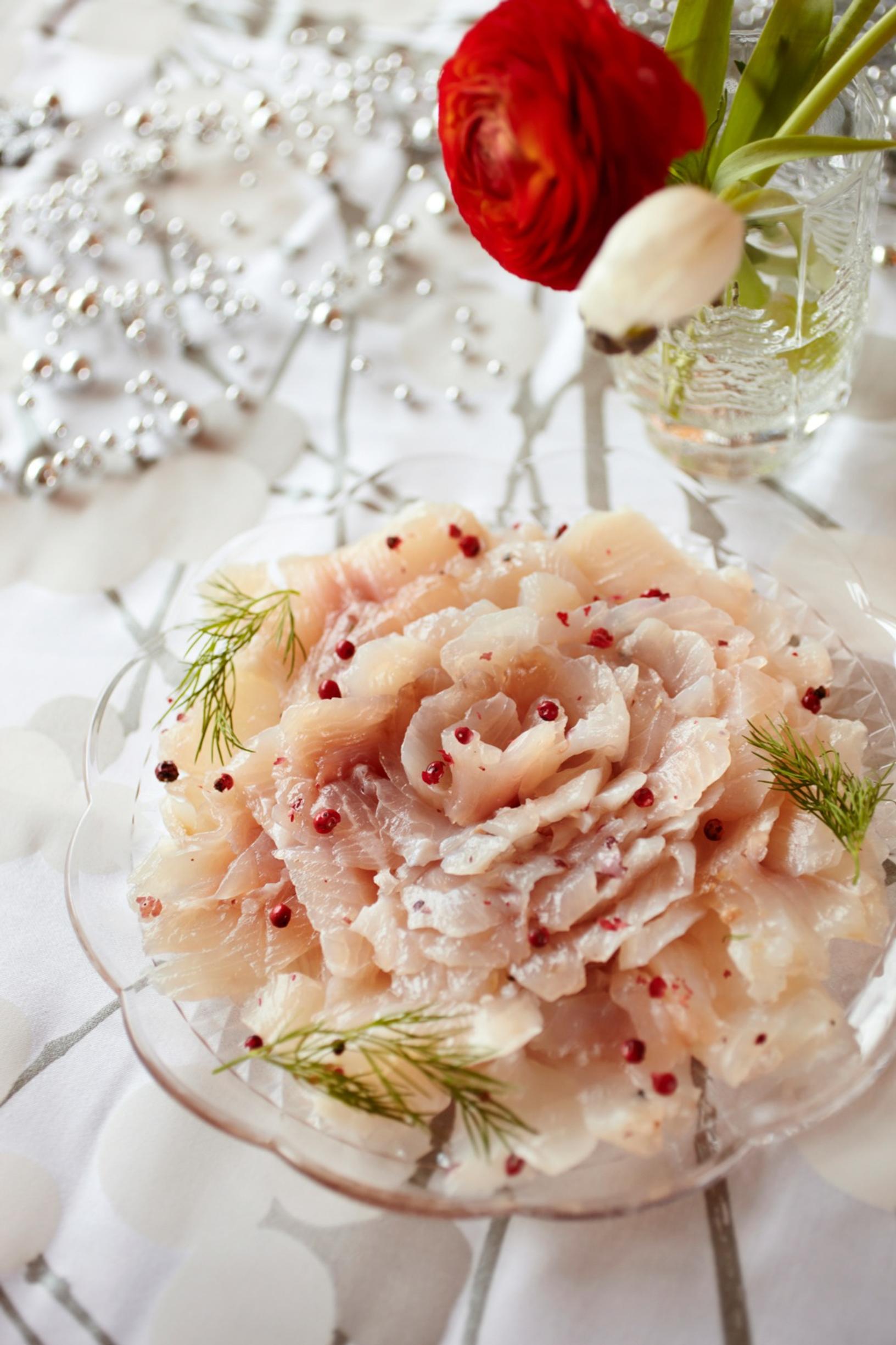 - Leikkaa siikafileet ohuiksi viipaleiksi tarjoiluvadille. Koristele jääkellarin siika tillillä ja roseepippurilla.