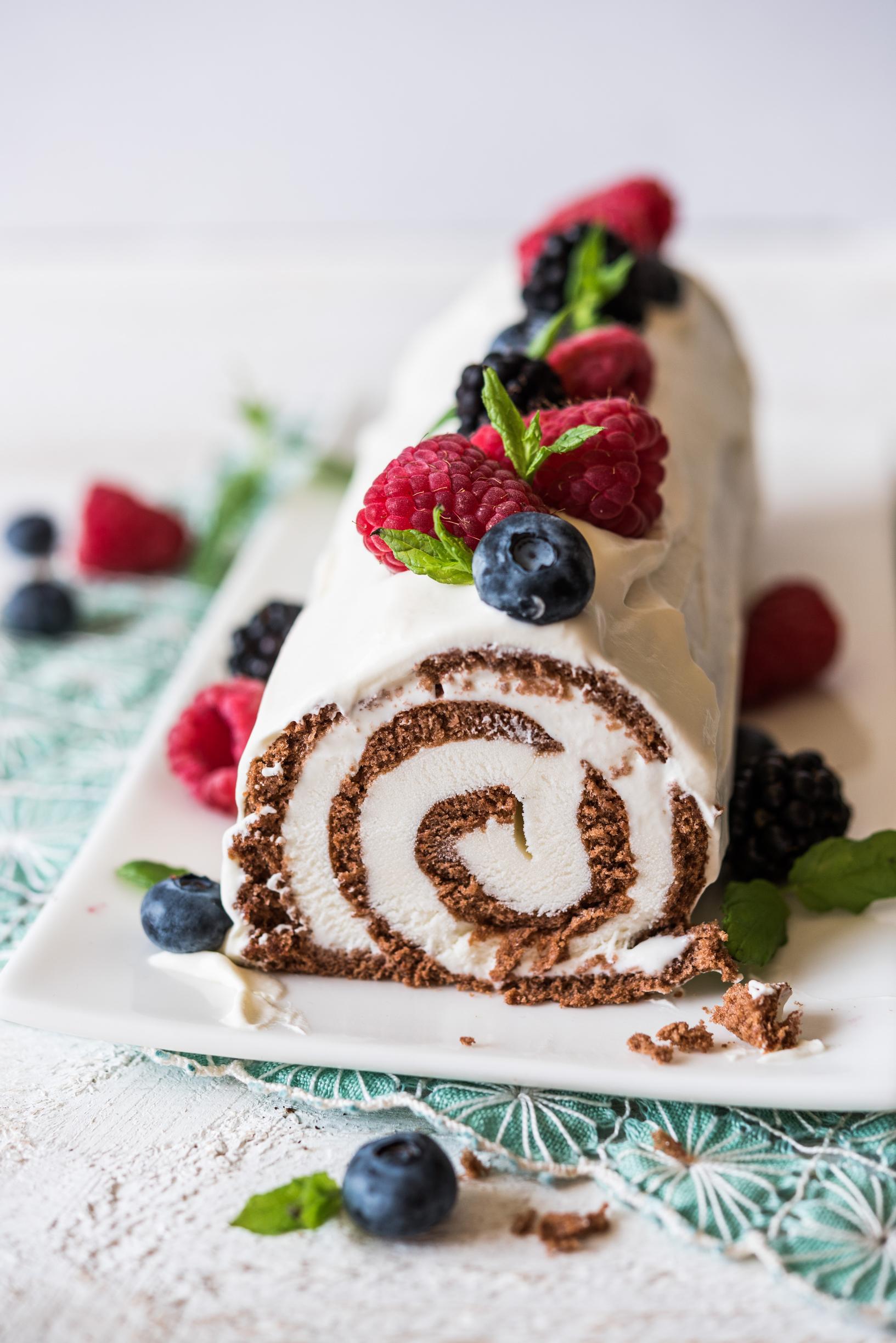 Täytä suklainen torttupohja vaniljajäätelöllä ja kääräise se rullalle. Koristele tämä kesäinen herkku tuoreilla marjoilla ja nauti välittömästi.