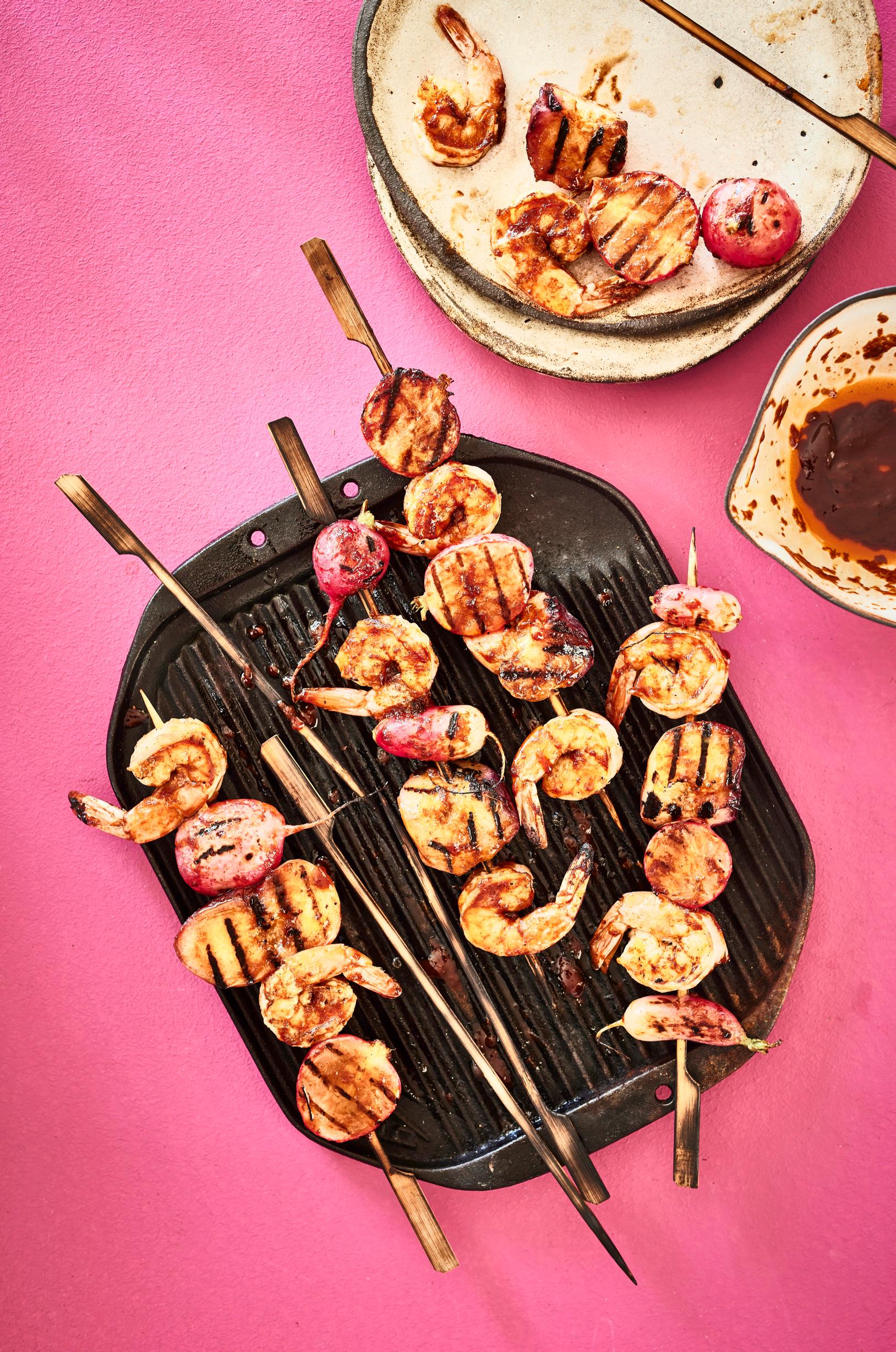 Jättikatkarapuvartaat ovat pihagrillin pikaruokaa. Jättikatkaravut ja persikat kypsyvät samaan tahtiin retiisien kanssa, joten kokin kannattaa pysyä tiukasti grillin äärellä.