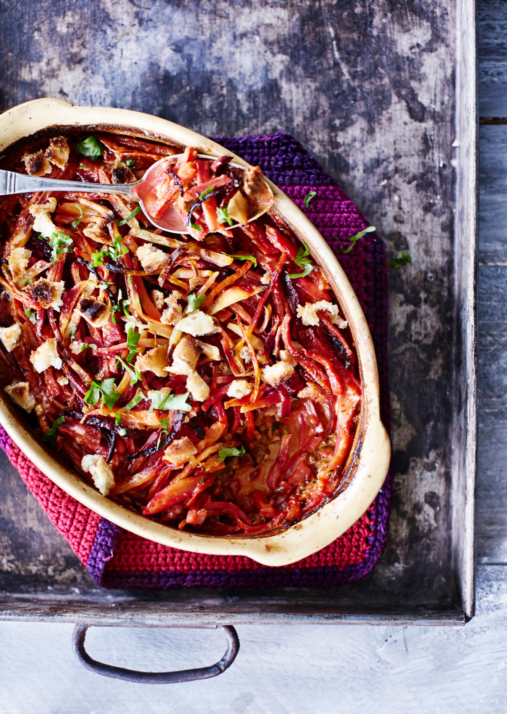 Paahda jauheliha pannulla sipulin kanssa. Lado juurekset ja jauhelihaseos kerroksittain voideltuun uunivuokaan.