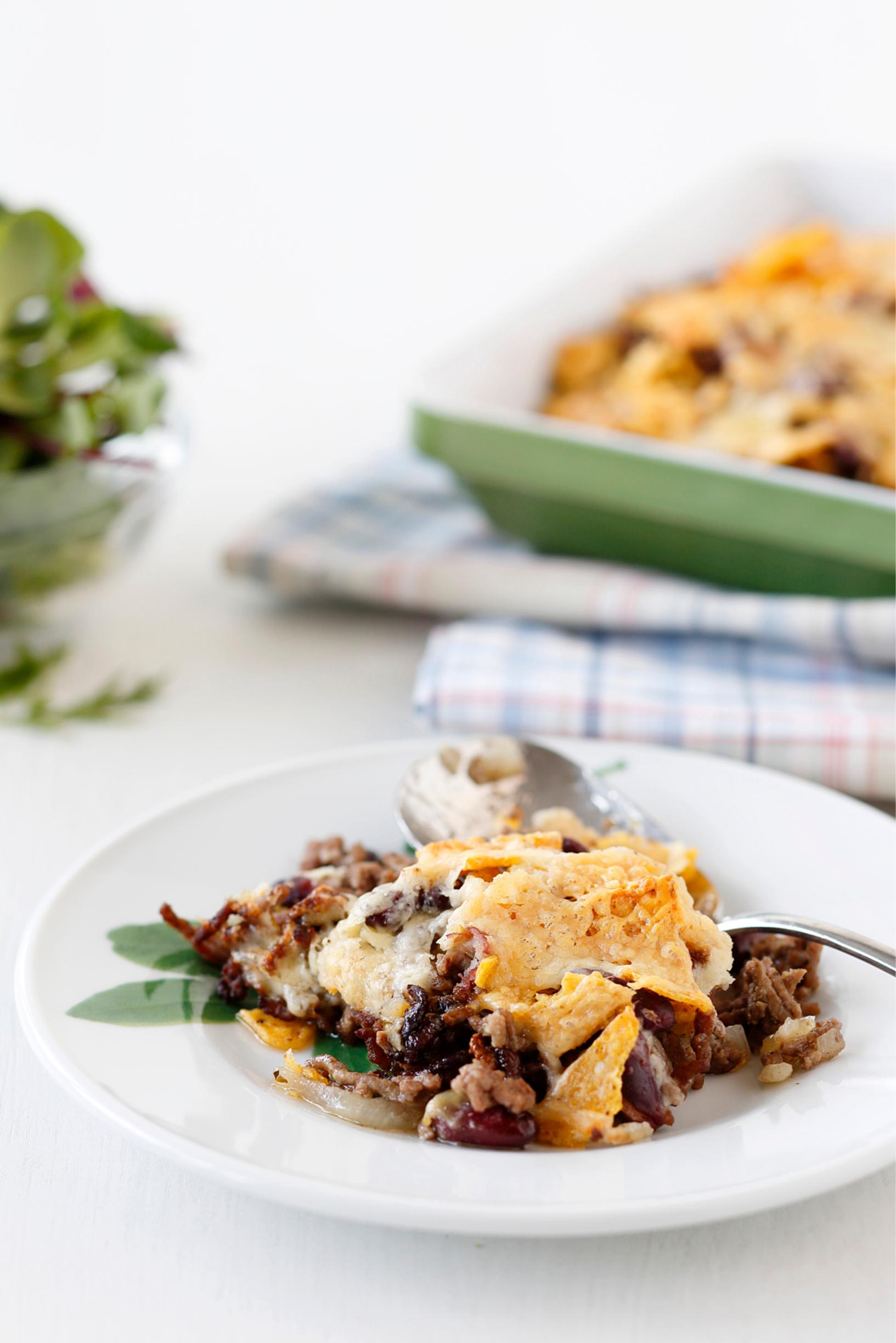 - Levitä jauheliha-papuseos öljytyn uunivuoan pohjalle. Lisää päälle murennetut maissilastut ja juustoraaste.