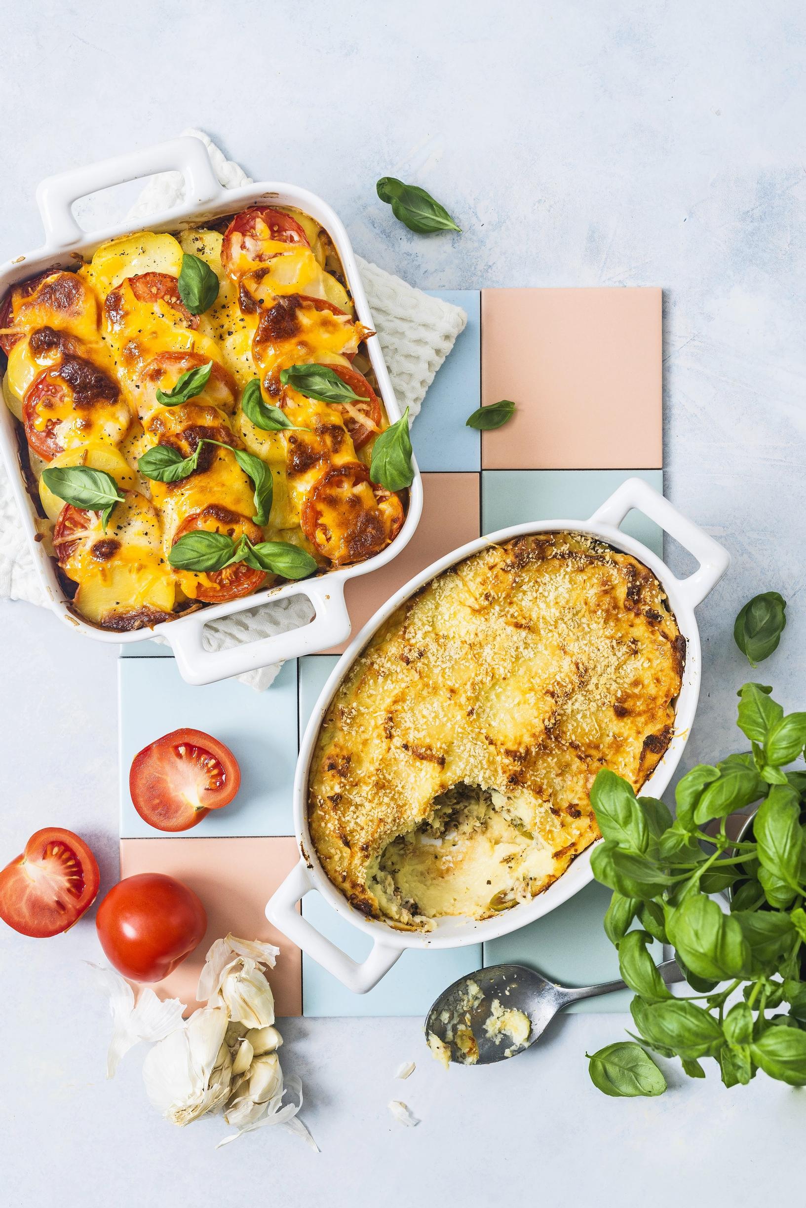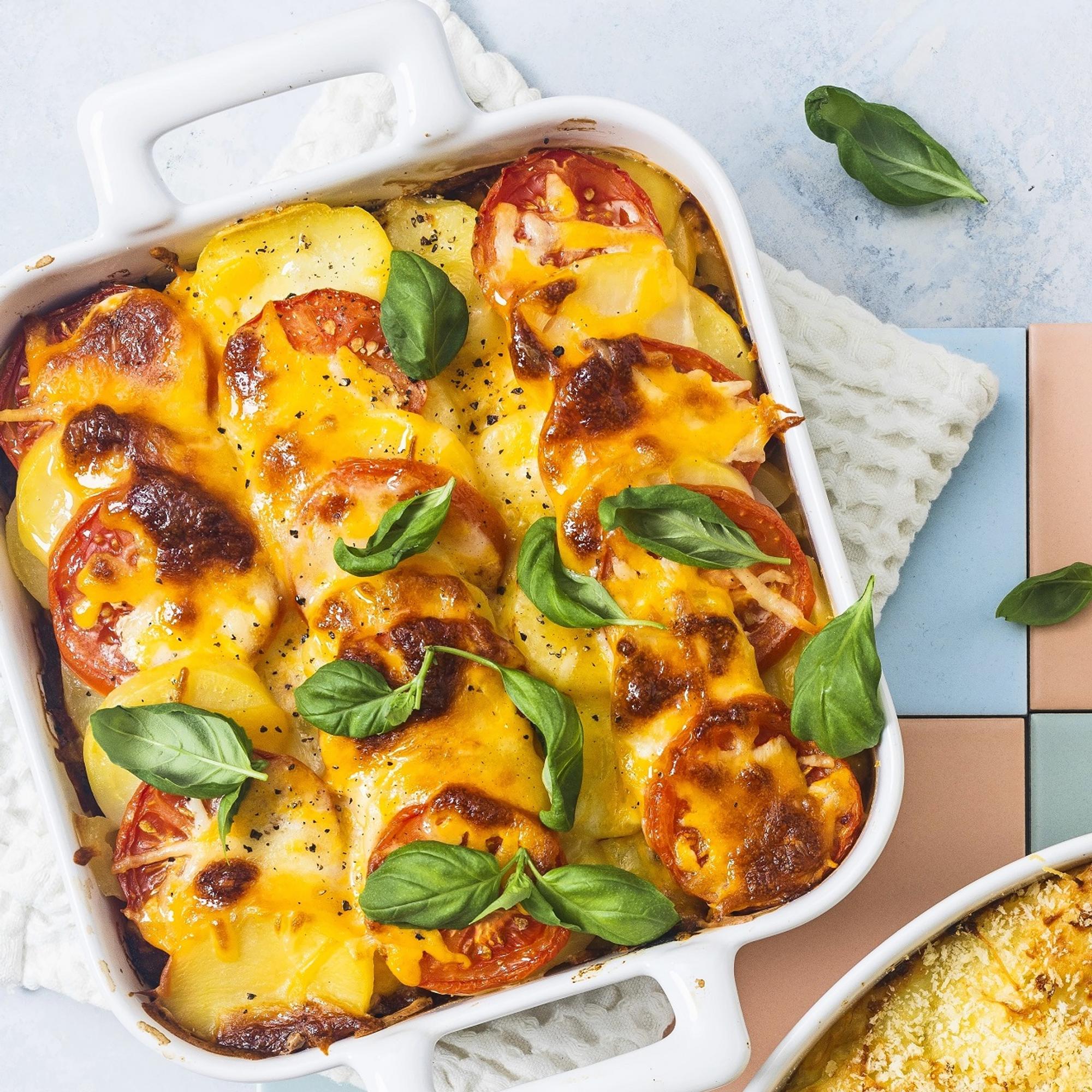 - Viipaloi tomaatit ja levitä ne perunaviipaleiden kanssa limittäin laatikon pinnalle. Ripottele loput juustoraasteesta pinnalle.