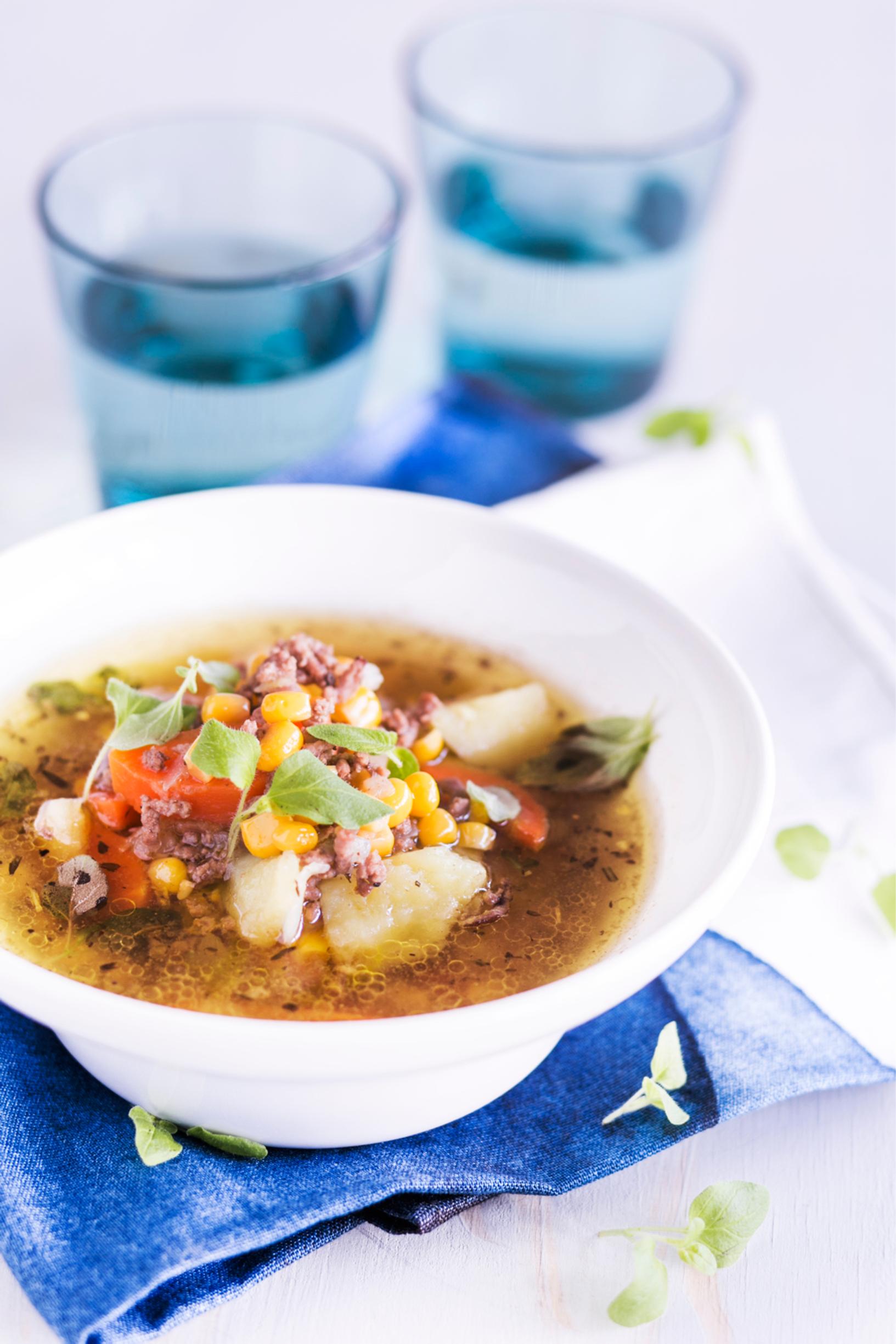 Maukas jauhelihakeitto maistuu niin kesällä kuin talvellakin. Arkiruokaklassikko saa kivaa väriä maissista ja yrteistä!