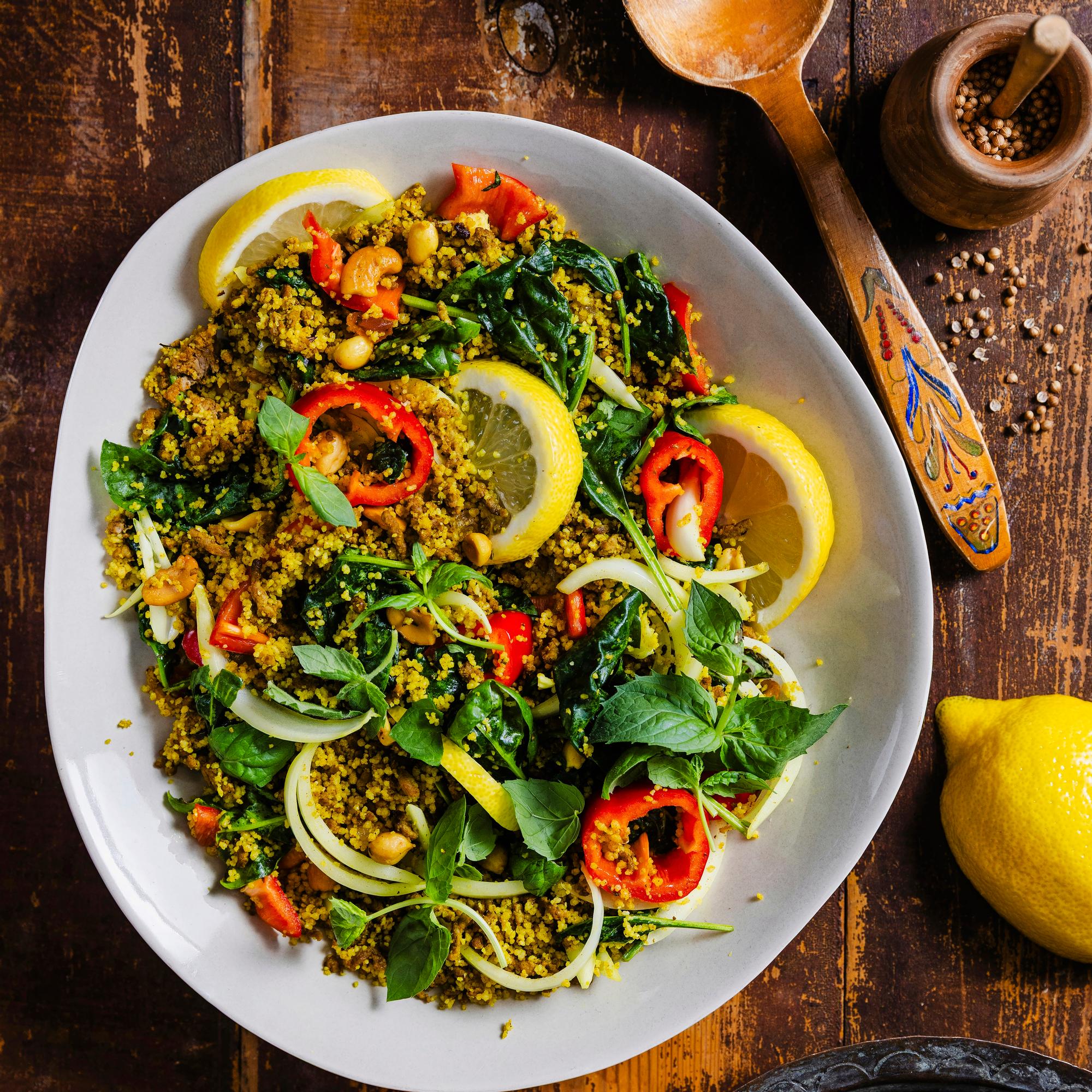 Pikana valmistuva jauhelihakuskus maustetaan marokkolaiseen tapaan kuivatulla mintulla, kurkumalla, korianterilla ja kanelilla. Salaattimainen ruoka toimii niin lämpimänä kuin kylmänä.