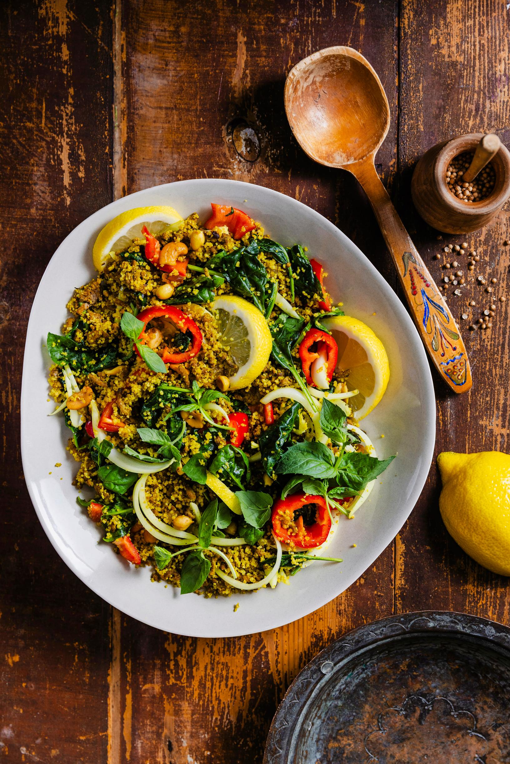 - Sekoita kuskusin joukkoon pinaatit, sipulit, paprikat ja tuoreet hienonnetut yrtit.