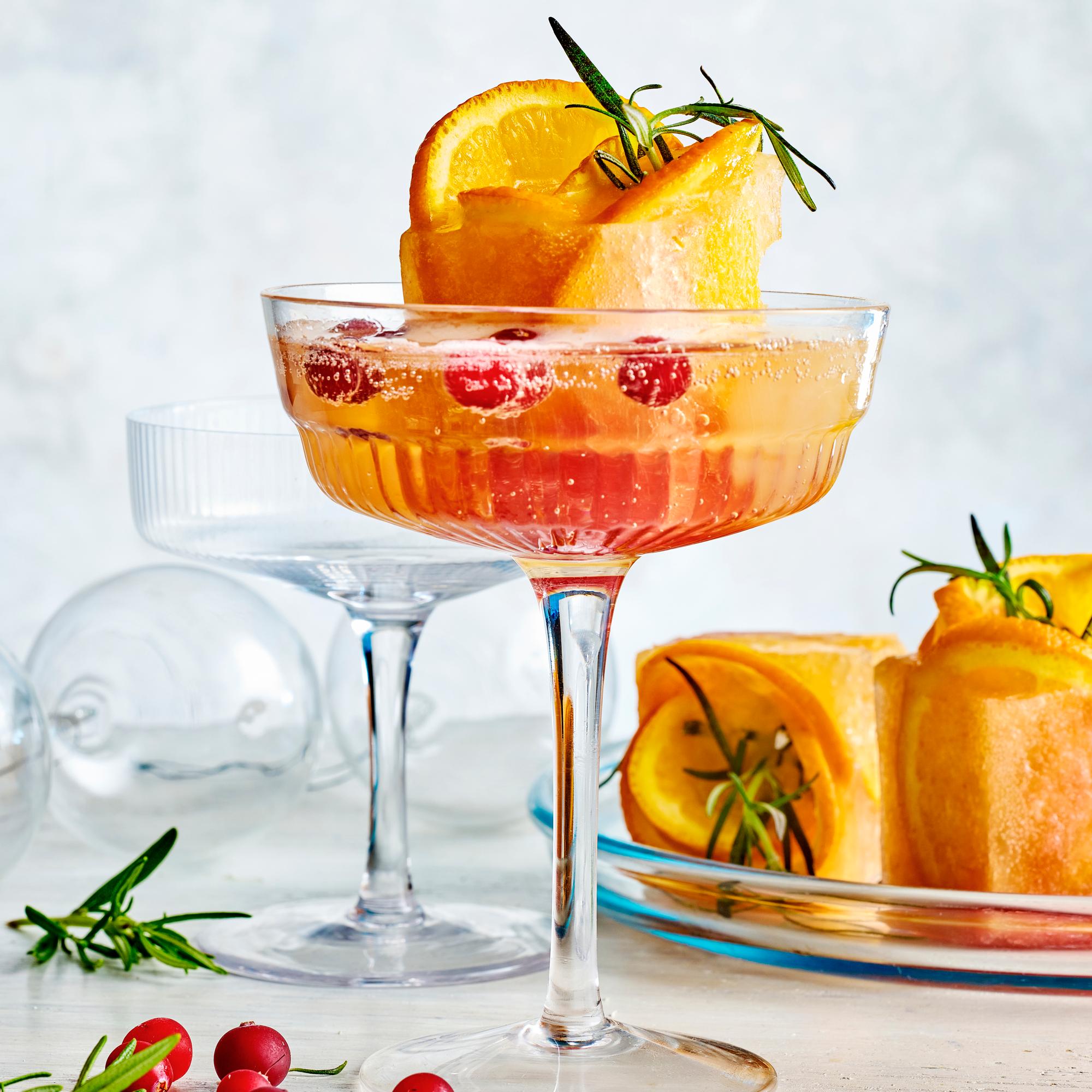 Joulujuhlan kippistelyjuoma yhdistää Bellinin ja Mimosan. Juomaa varten pakastetaan isoja jääpaloja hedelmäsoseesta, appelsiinisiivuista ja rosmariinista. Laita jääpalat lasiin, ja sekoita juoma suoraan jäiden päälle.