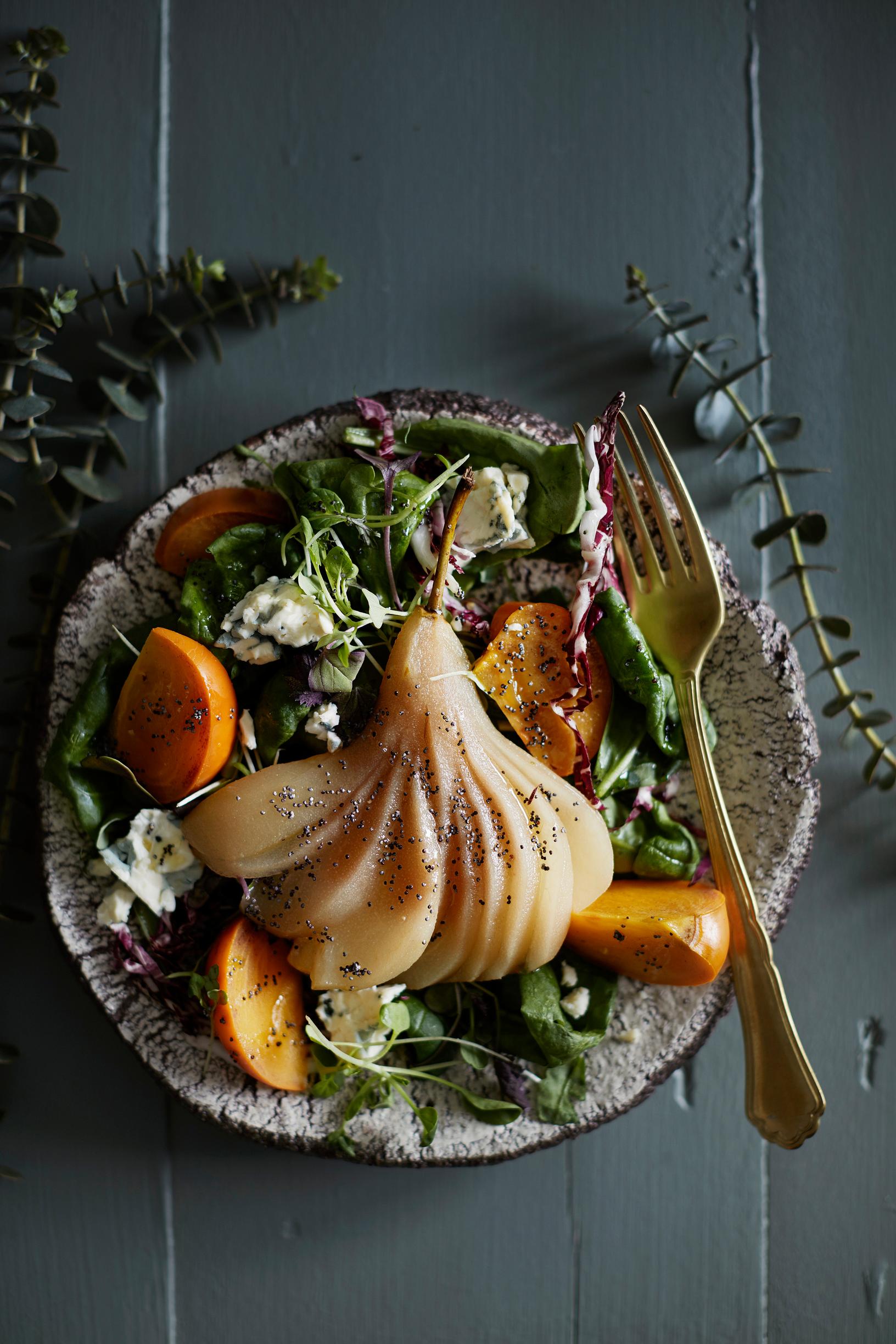 Jouluisen salaatin koukuttavuuden salaisuus on raikas salaattipohja sekä glögiliemessä keitettyjen hedelmien ja sinihomejuuston lähes taianomainen yhdistelmä. Kruunaa joulun koukuttavin salaatti näyttävällä unikkokastikkeella.