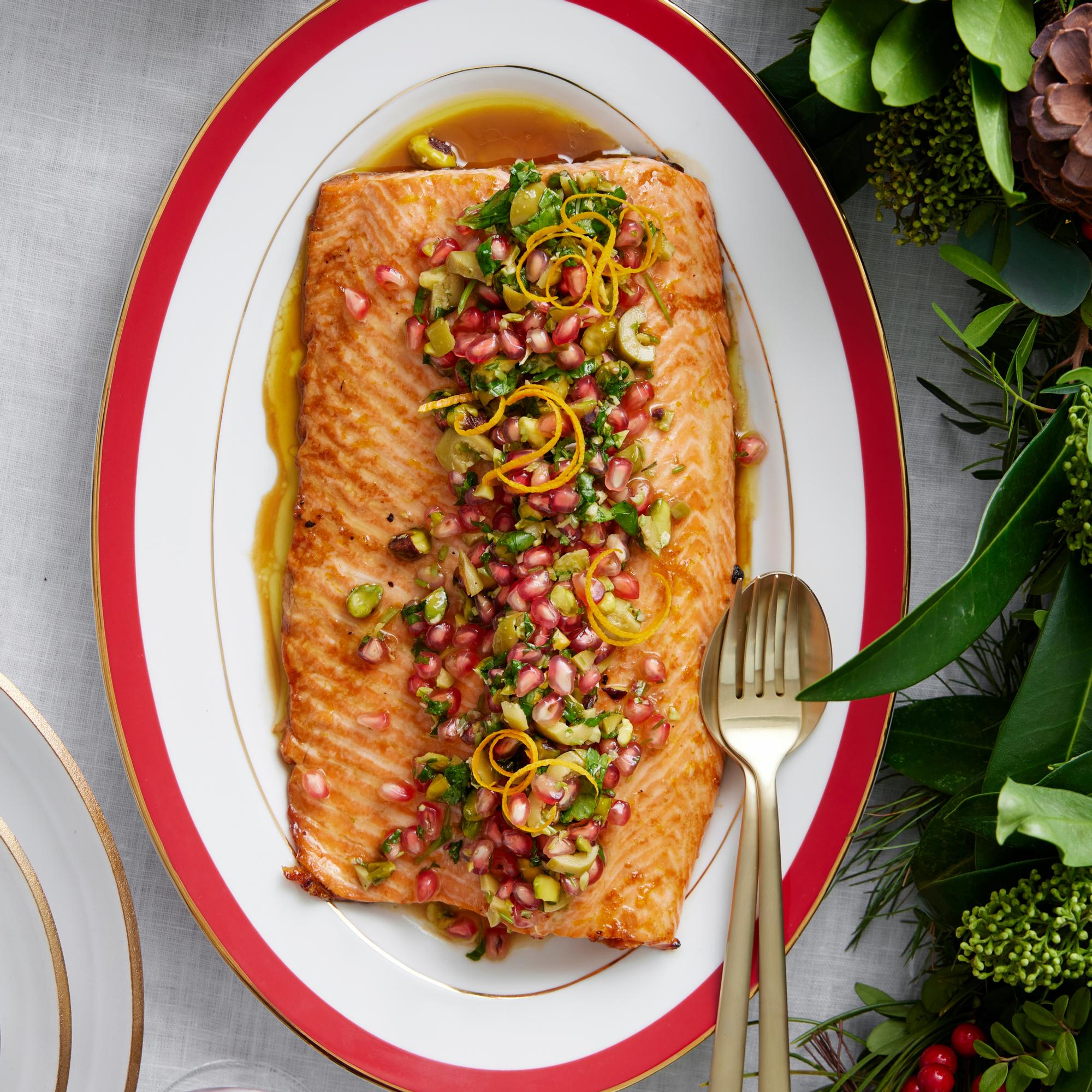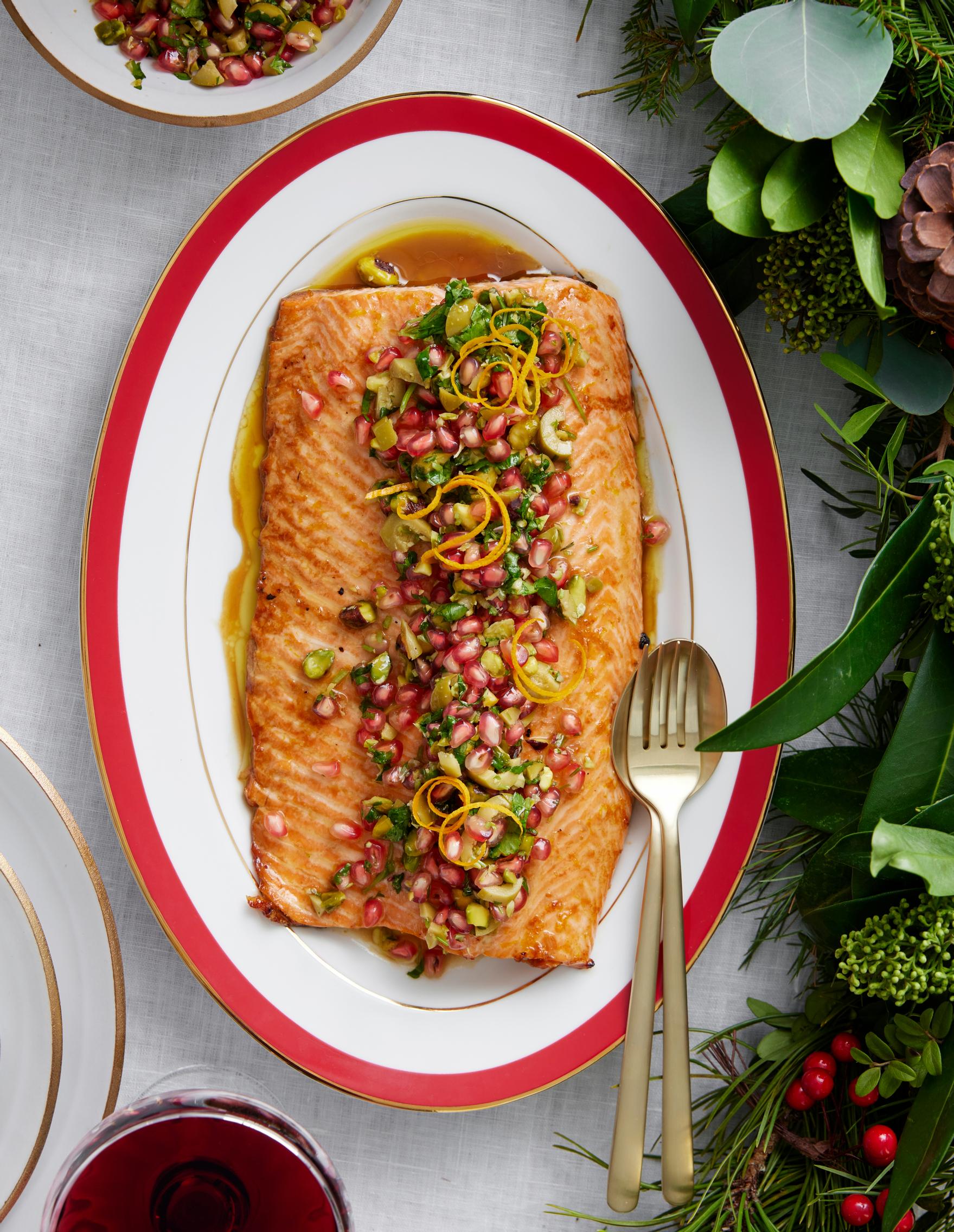 Joululohi maustetaan appelsiinimarinadilla ja pinnalle lusikoidaan pistaasitapenadea. Raikkaat granaattiomenansiemenet kimaltavat juhlavasti lohen pinnalla.