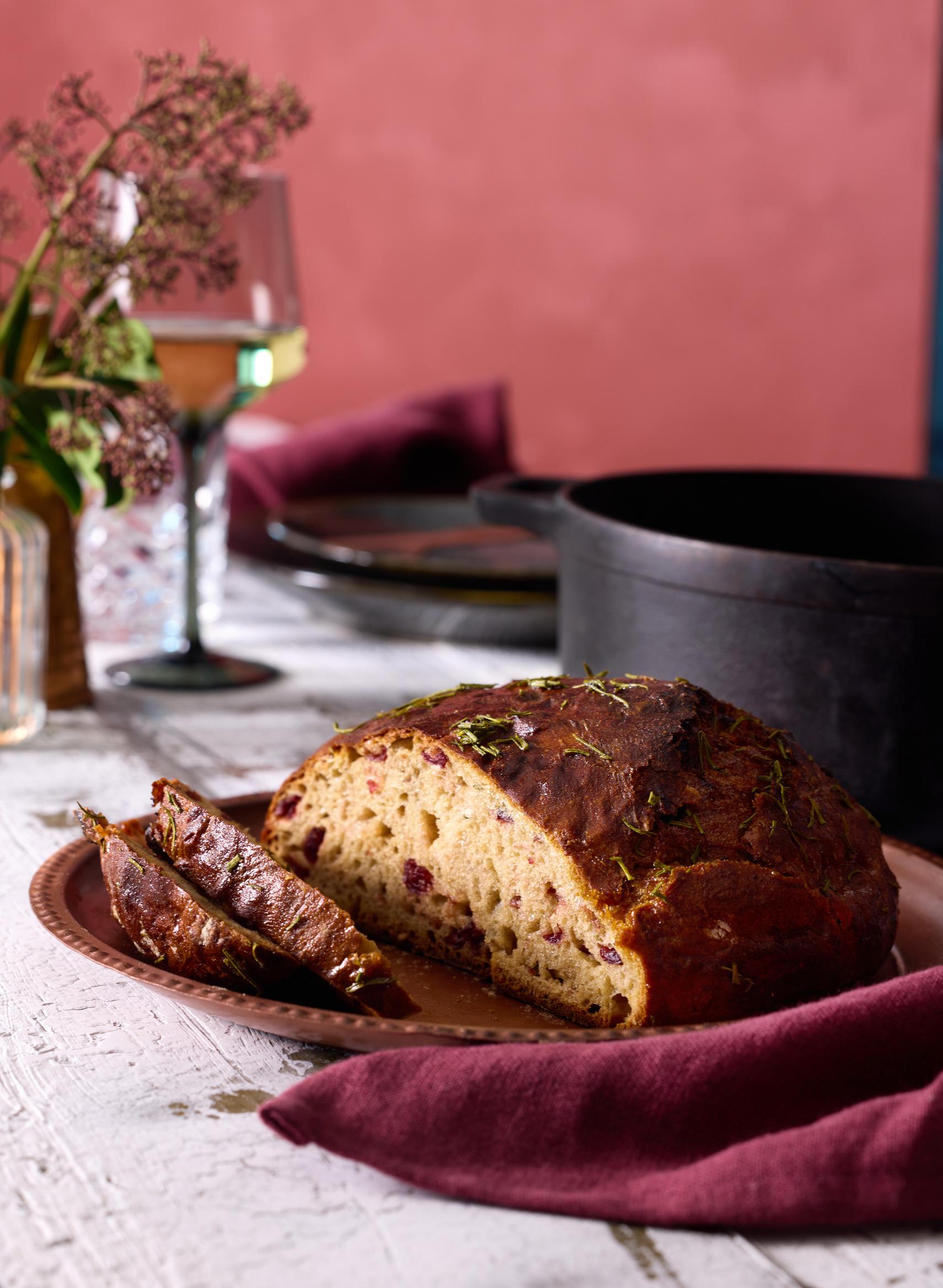 Karpalon ja rosmariinin yhdistelmä sopii jouluiseen pataleipään kuin hiippalakki tontun päähän. Pataleipä valmistuu todella pienellä vaivalla, kunhan annat taikinan kohota kaikessa rauhassa.