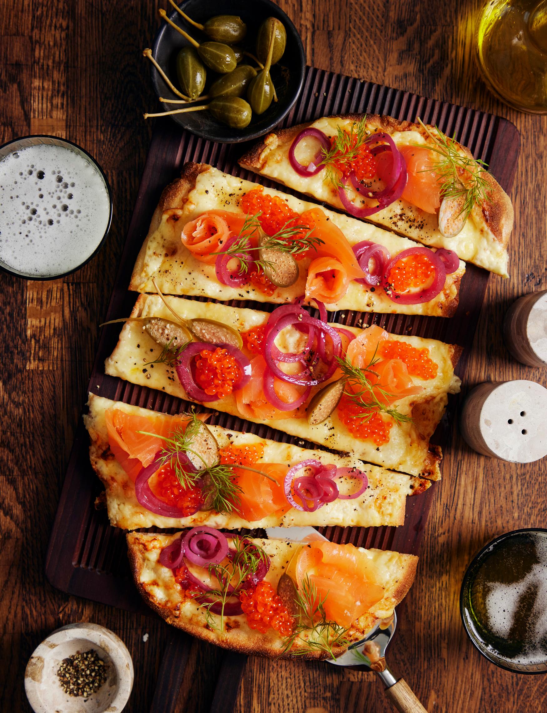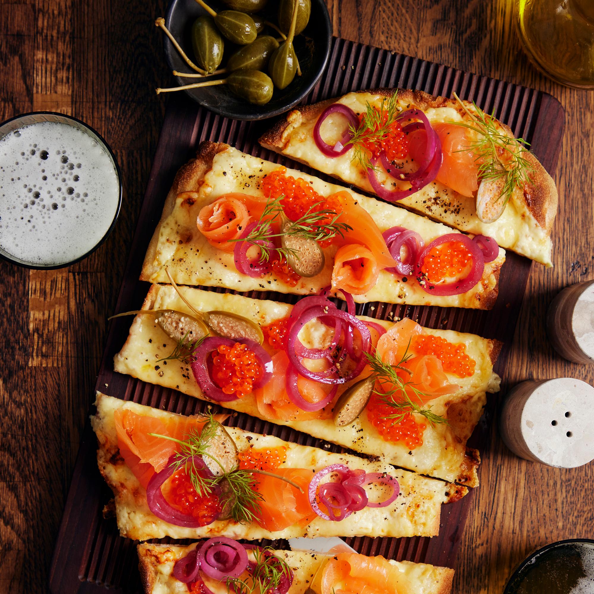 Joulupinsa hurmaa helppoudellaan! Valmis pinsapohja paistetaan rapeaksi ja täytetään kylmäsavulohella, mädillä, smetanalla ja marinoidulla punasipulilla.