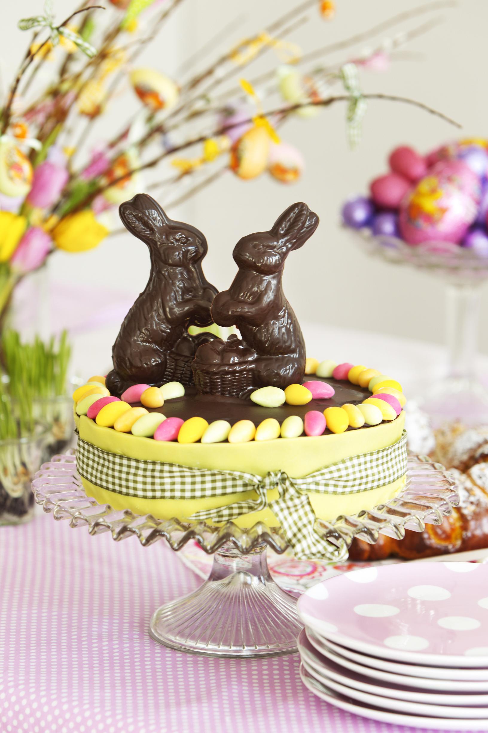 - 12Koristele reunat kaulitulla marsipaanilla. Kakun päälle voit tehdä muotin avulla sulatetusta suklaasta esimerkiksi pääsiäispupun tai koristella sen pääsiäiskarkeilla.