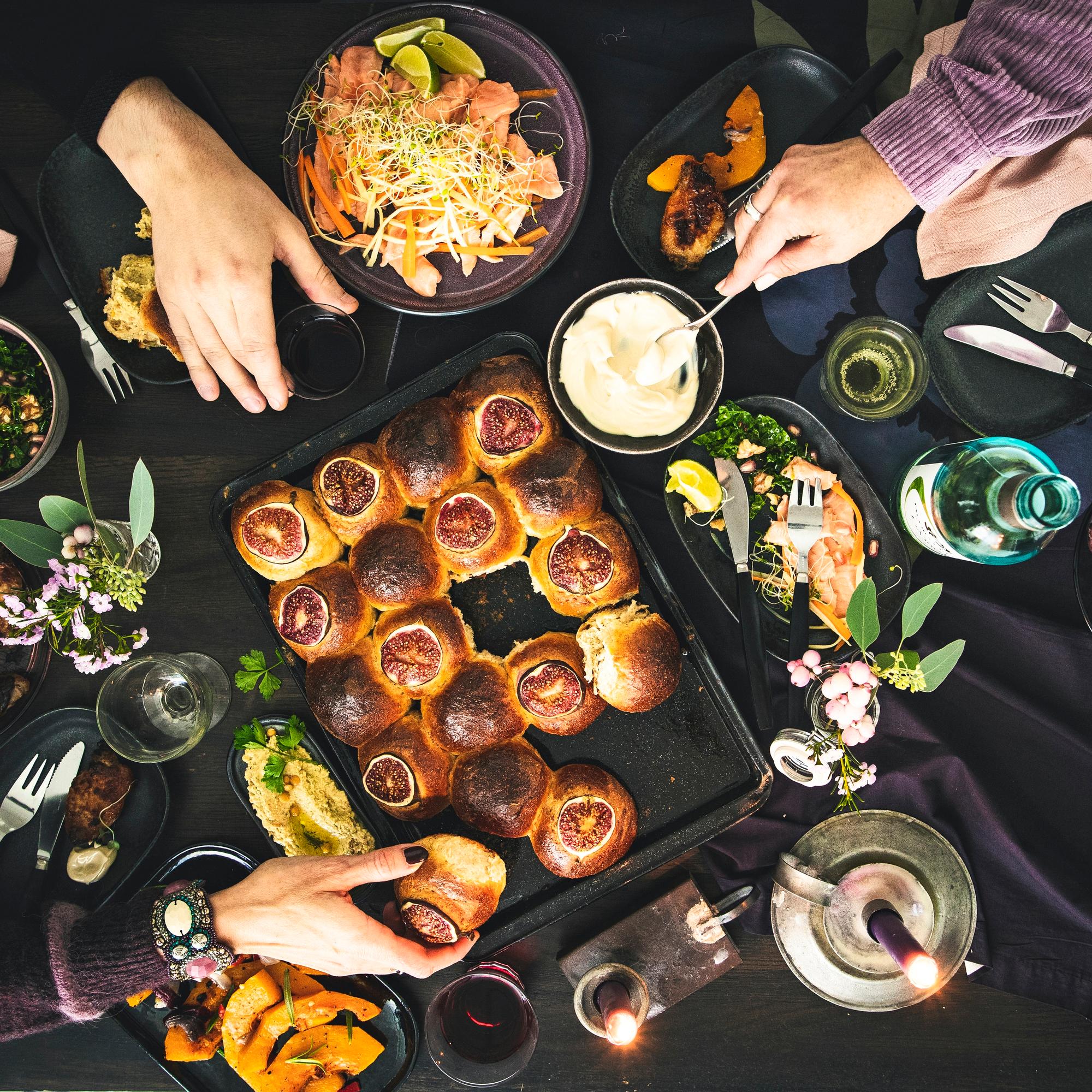 Juhlava sämpyläpelti on jaettava ja herkullinen vaihtoehto perinteiselle leivälle. Makeahkot, viikunoiden koristamat sämpylät maistuvat mainioilta suolaiseen feta-linssitahnaan dipattuna.