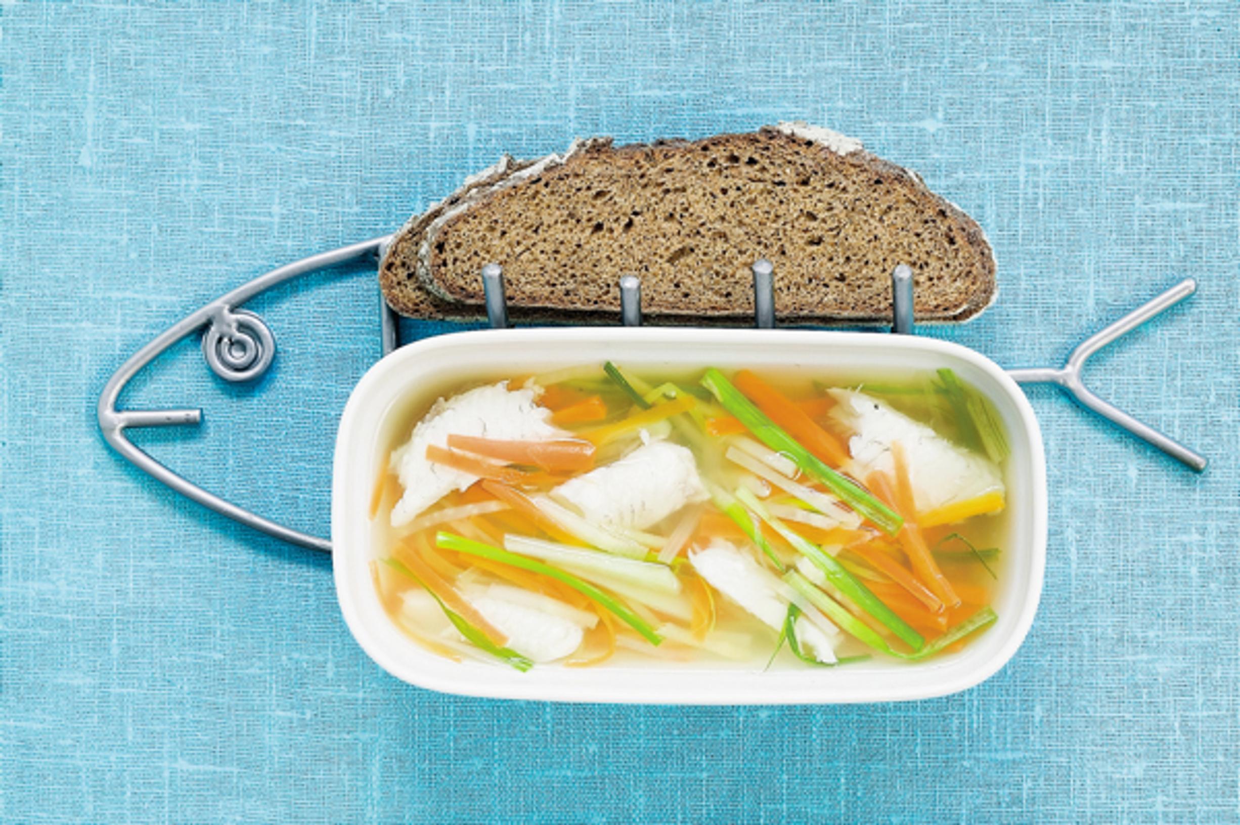 Kuori juurekset ja pilko ne tulitikkumaisen ohuiksi suikaleiksi. Nosta suikaleet kattilaan. Kaada kalaliemi päälle ja keitä juuressuikaleita 5 minuuttia. Suikaloi kevätsipulit ja lisää ne kattilaan. Jatka keittämistä 2 minuuttia. Lisää kalapalat kattilaan ja kuumenna kiehuvaksi.