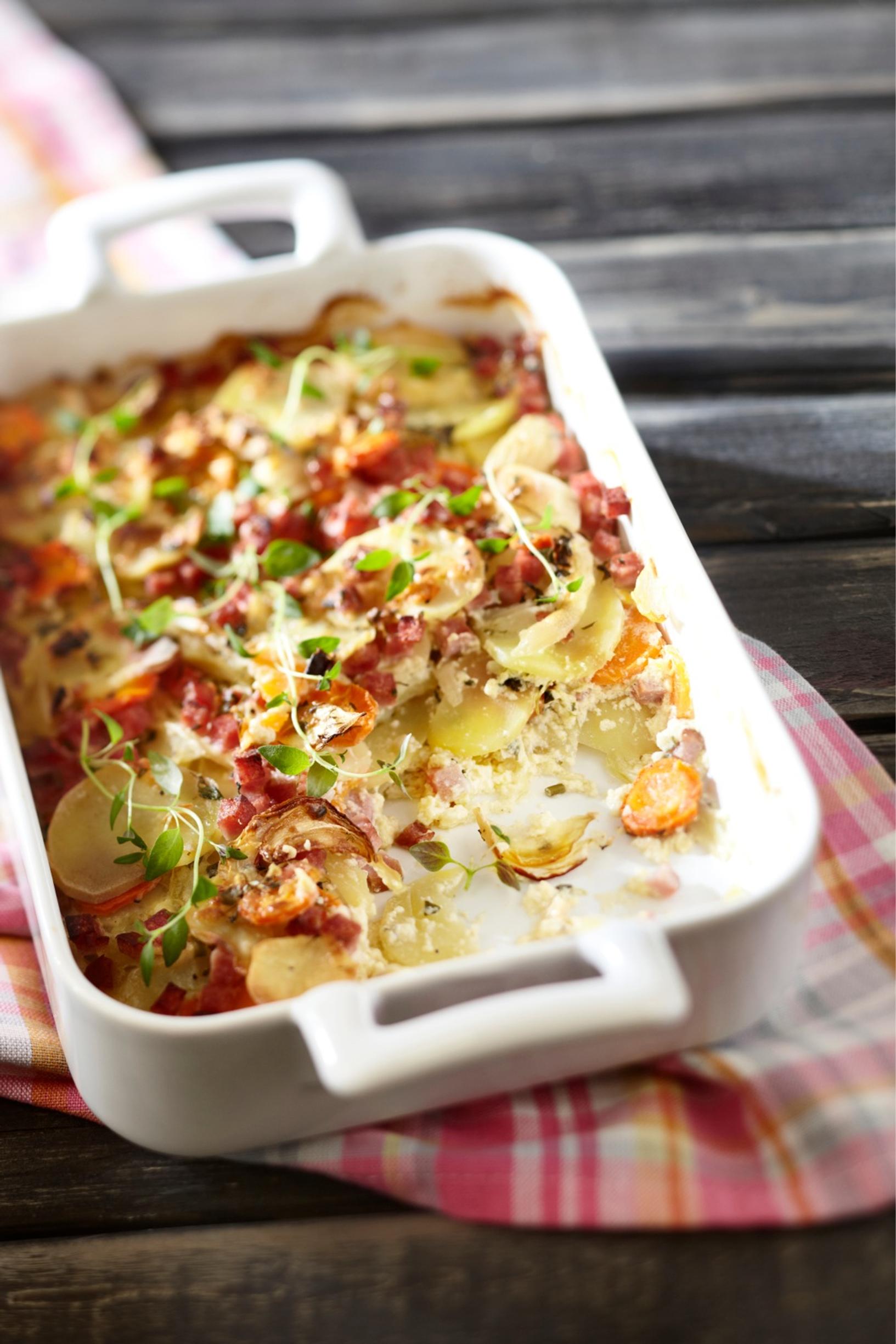 - Halutessasi voit korvata palvikinkun ruskistetulla jauhelihalla. Ruoan valmistusta nopeuttavat tarvittaessa pakastetut perunaviipalesekoitukset.