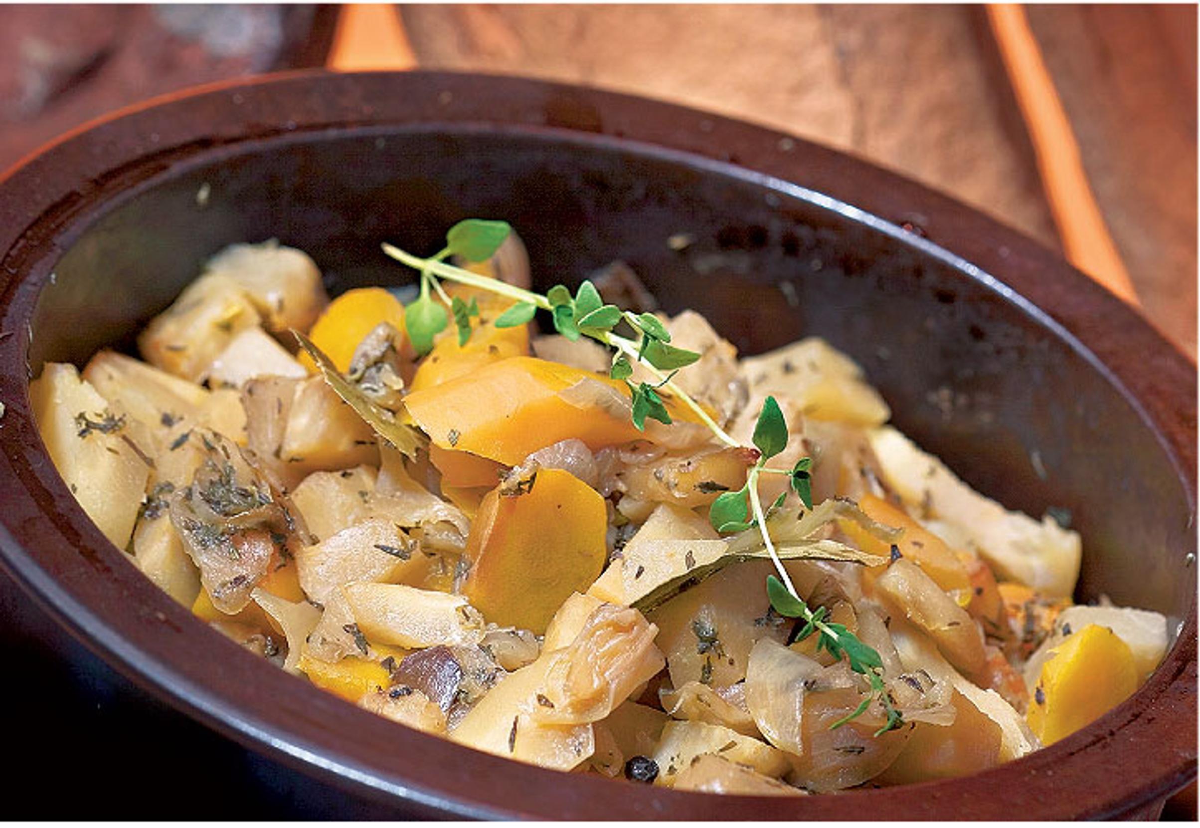 Kuori ja kuutioi lantut, palsternakat, porkkanat, sipulit ja kaali. Lado vihannekset uuninkestävään vuokaan. Valitse mielellään kannellinen astia. Mausta mustapippurilla, laakerinlehdillä, timjamilla ja murennetuilla liemikuutioilla. Kaada päälle vesi.