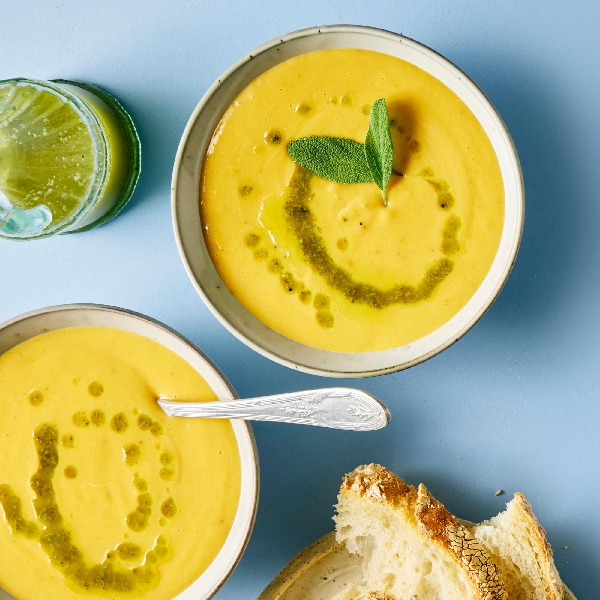 Juustoinen kurpitsakeitto – syksyinen soppa saa makua juustosta ja ruokaisuutta kikherneistä