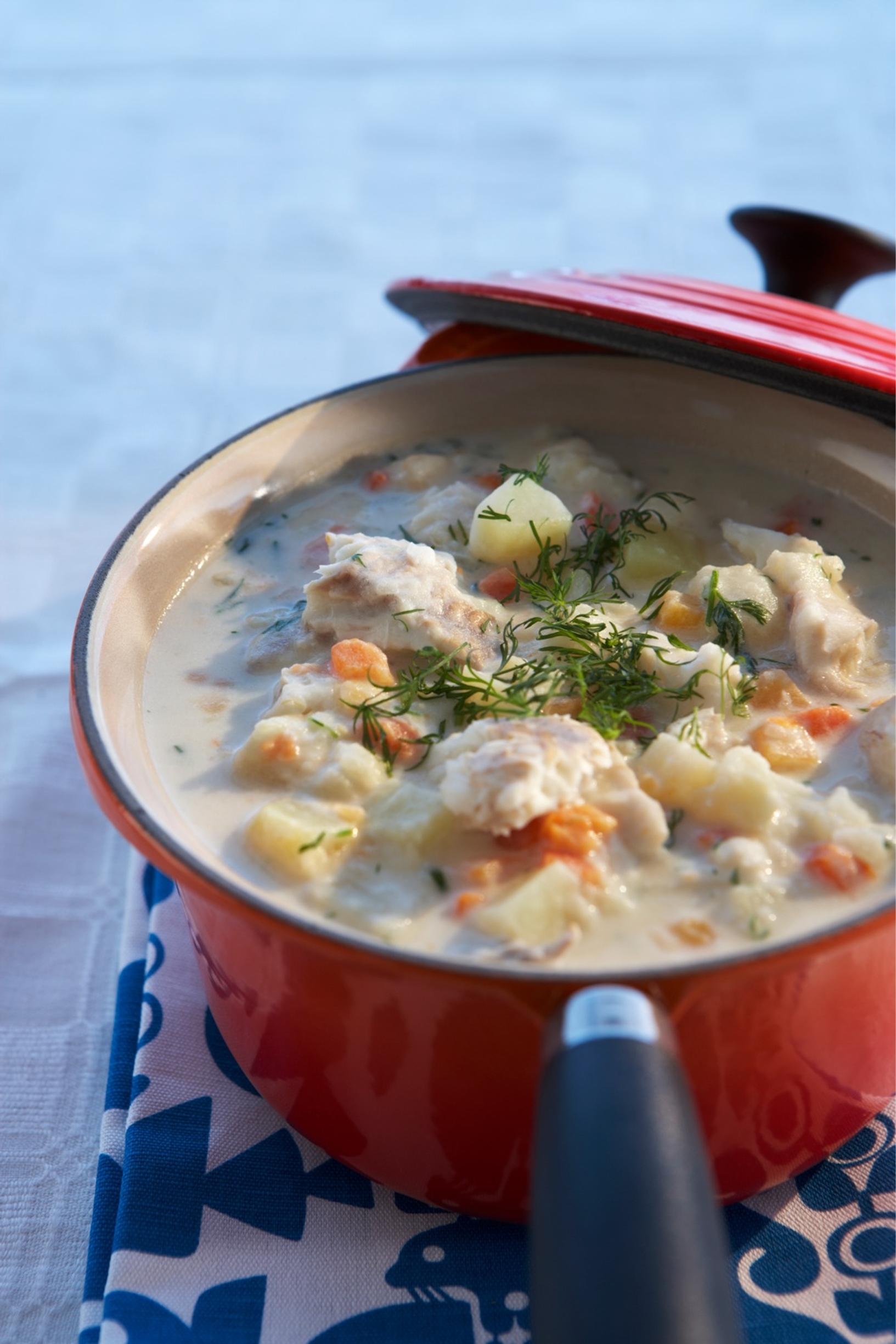 - Lisää keittoon ruokakerma ja paloitellut madefileet. Kuumenna kiehumispisteeseen.