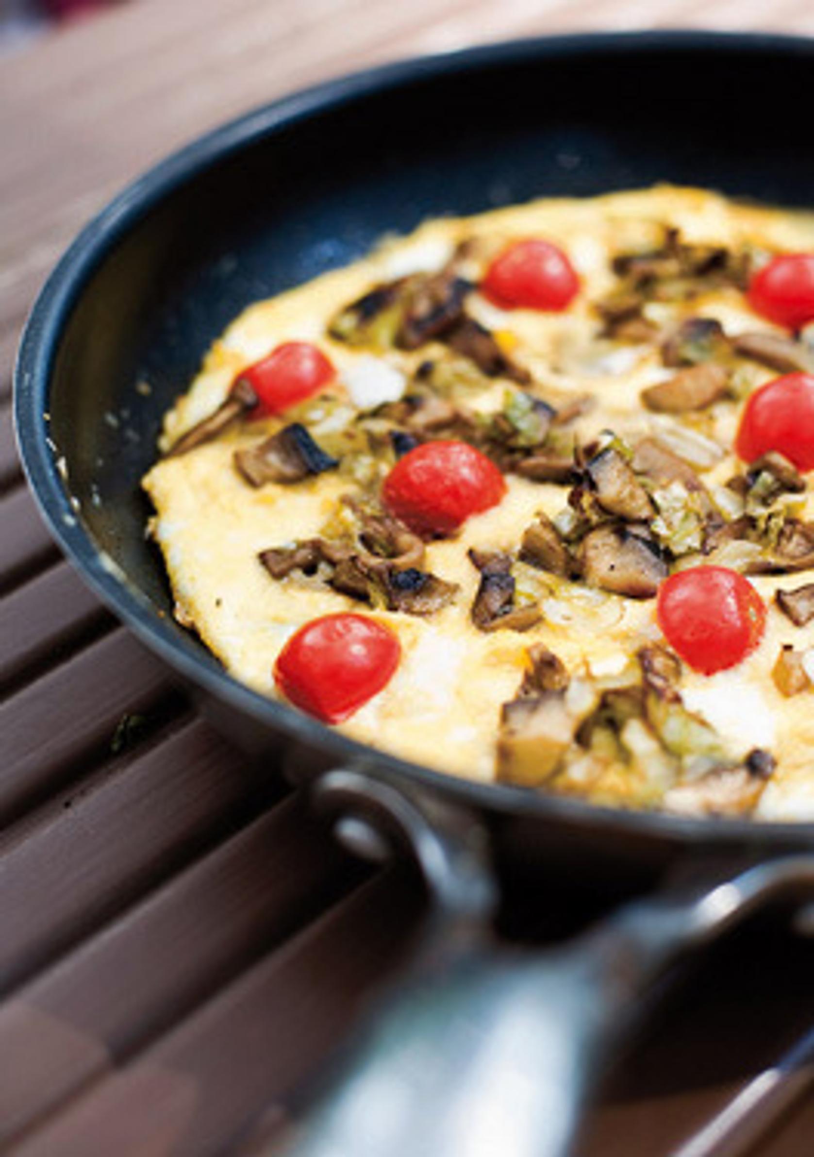 Lisää munakkaan pintaan sieni-kaaliseos ja halkaistut kirsikkatomaatit. Kypsennä vielä hiljalleen noin 5 minuuttia.