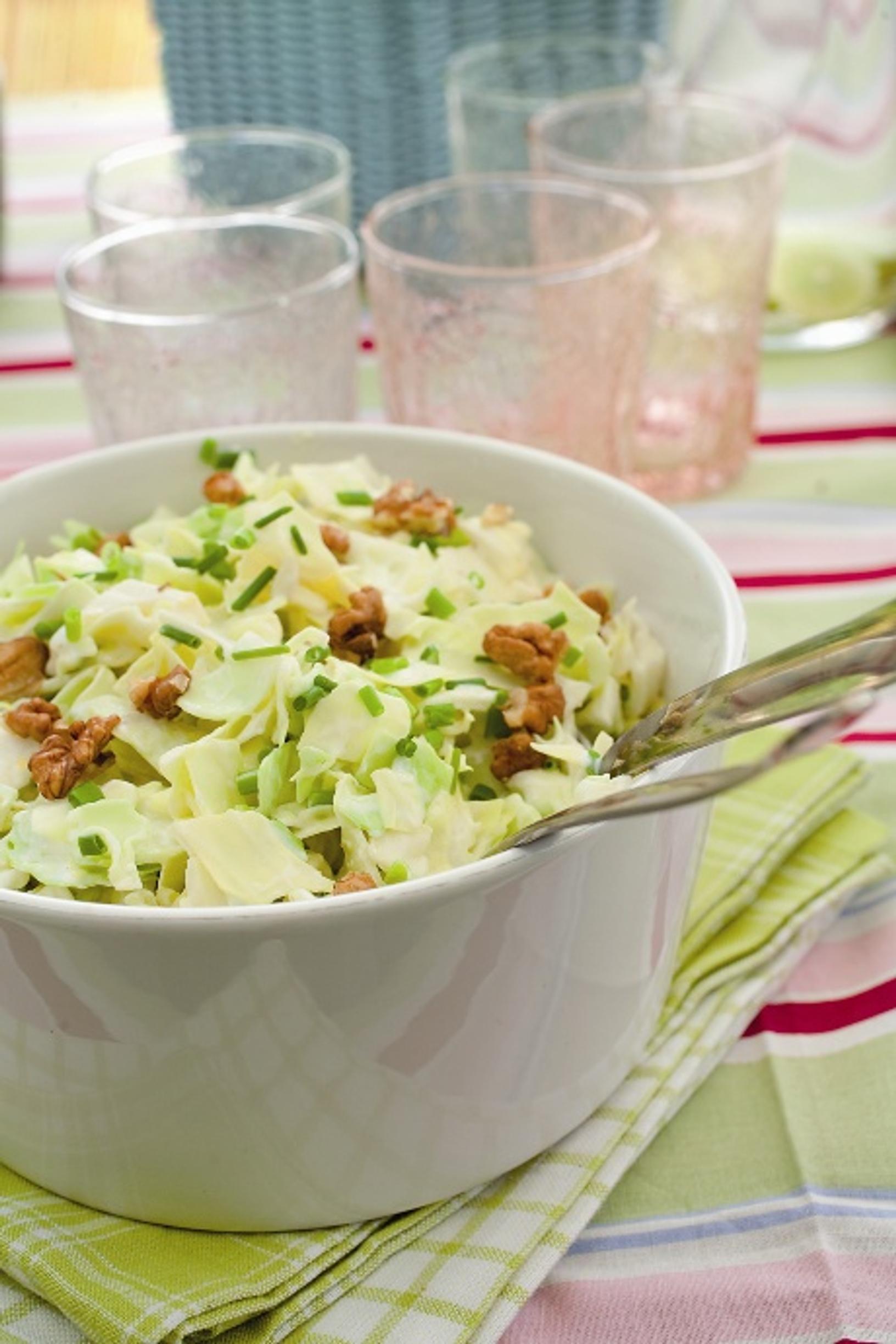 3. Lisää pähkinät ja hienonnettu ruohosipuli kaalisalaattiin.
