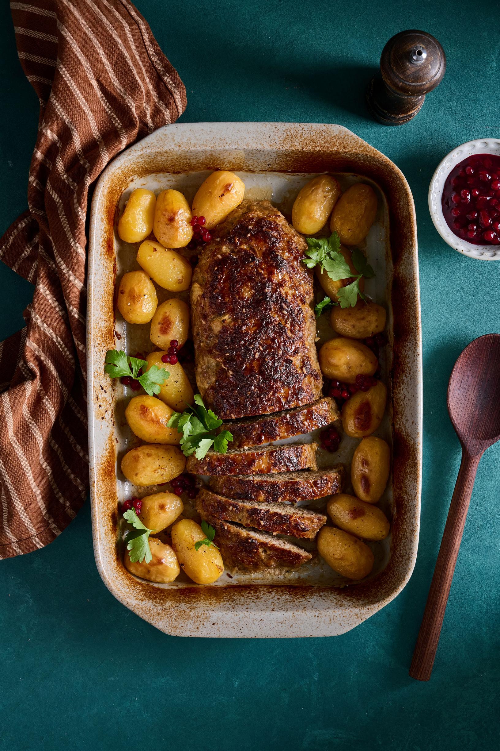 - Lisää murekkeen ympärille kuoritut perunat. Valuta perunoiden päälle öljyä ja mausta suolalla. Paista 200-asteisessa uunissa 30 minuuttia.
