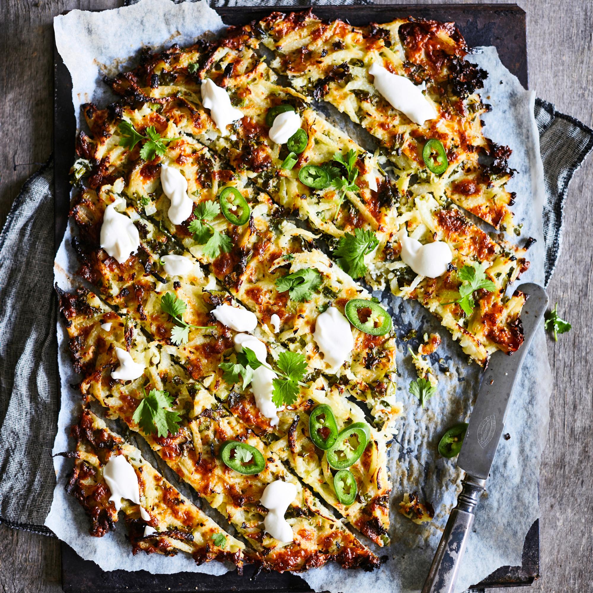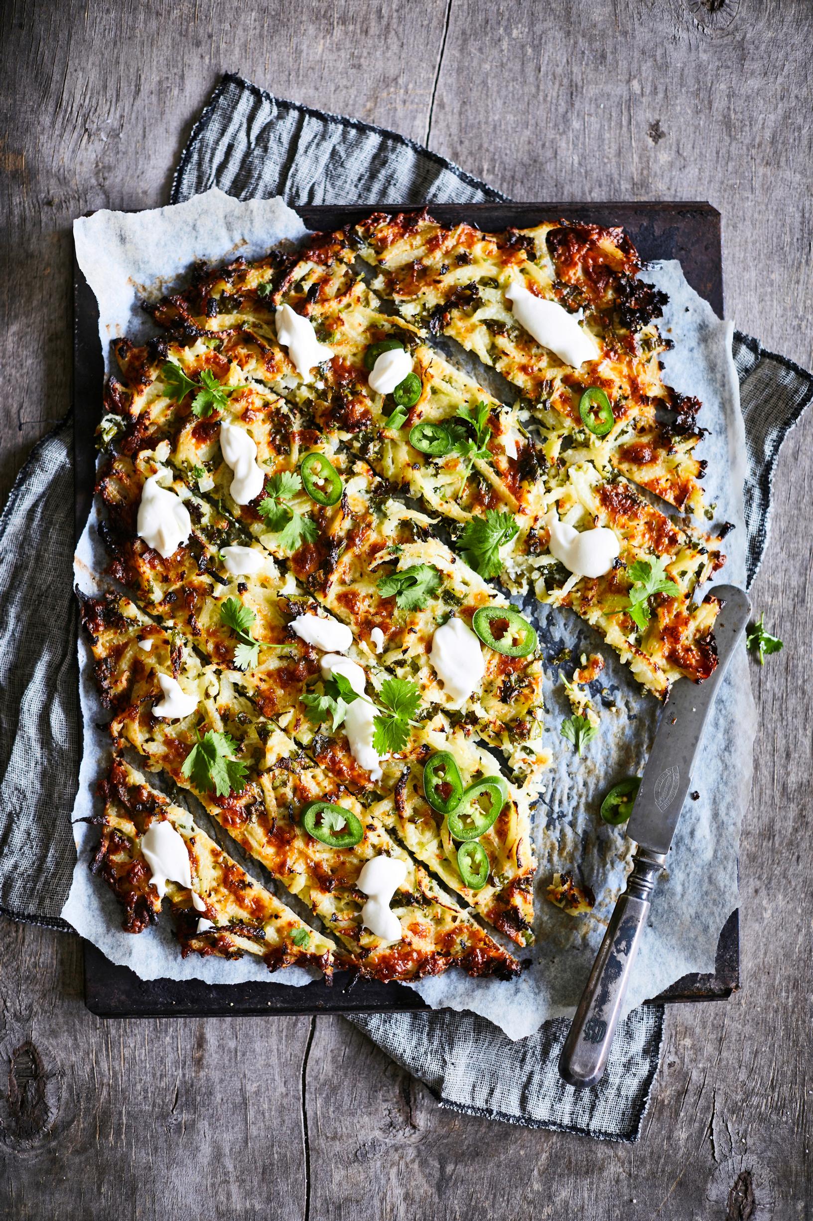 Melkein kuin pizza, muttei kuitenkaan! Kaaliröstipelti valmistuu näppärästi uunissa koko porukalle. Näyttävä peltiruoka viimeistellään jalapenoilla, vuohenjuustomoussella ja korianterilla.