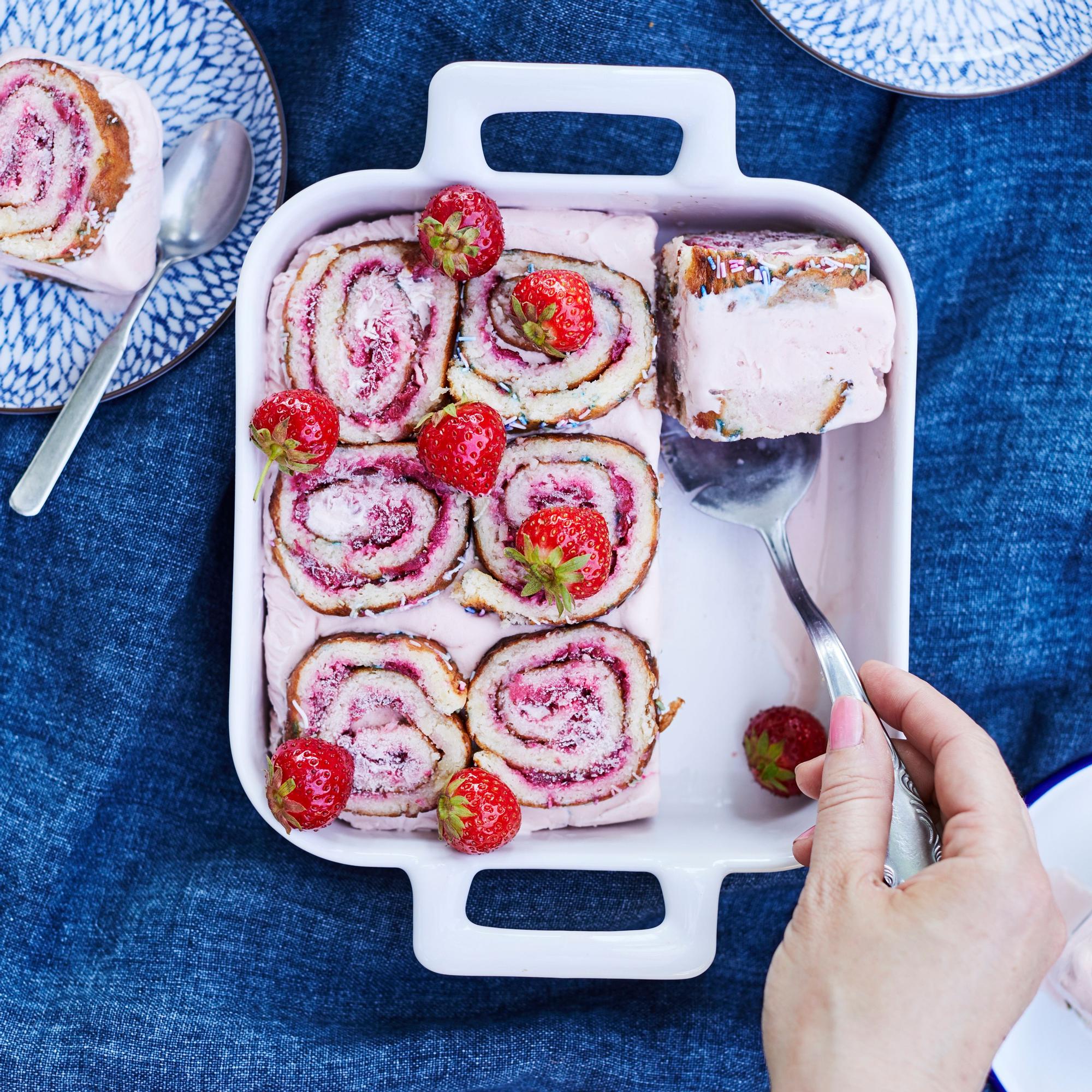 Oikaise ja tee jätskikakku kaupan valmiista mansikkakääretortusta.