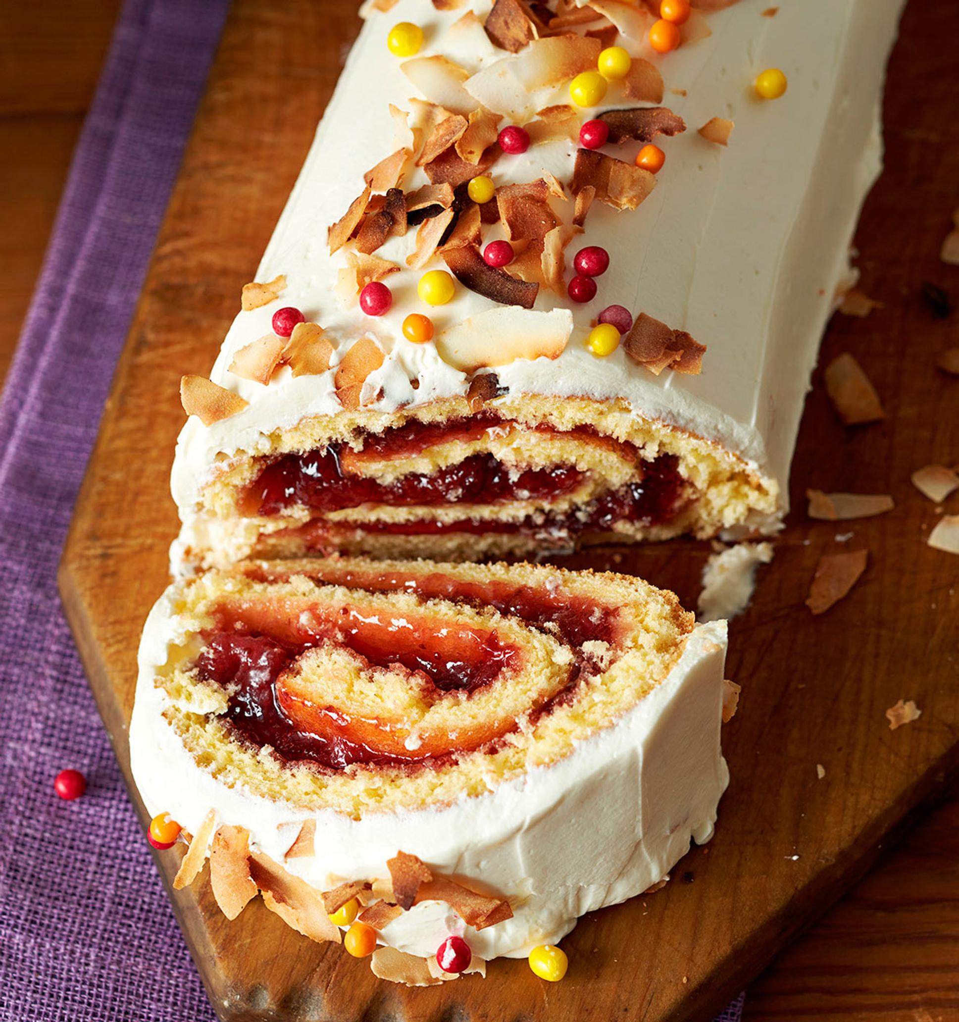 Valmista ja paista pohjataikina perusohjeen mukaan. Täytä torttu 1 ½ dl:lla mansikka- tai muuta hilloa. Kuorruta kääritty torttu perusohjeen kerma-rahkaseoksella. Koristele paahdetuilla kookoslastuilla ja koristerakeilla.