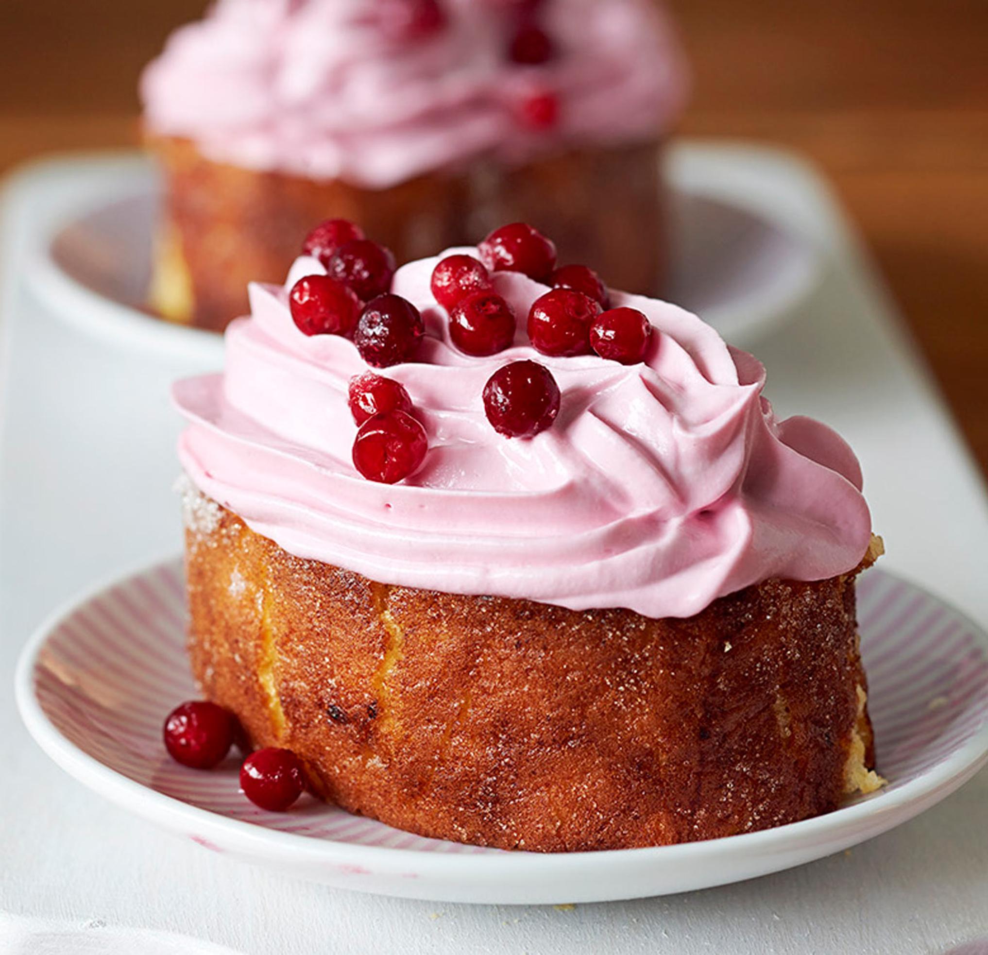 Korvaa perusohjeen jauhot 1 dl:lla mantelijauhetta ja ½ dl:lla perunajauhoja. Tee täyte kuten perusohjeessa, mutta korvaa rahka tuorejuustolla ja mansikkahillo puolukkahillolla. Vatkaa koristeeksi 2 dl kermaa, lisää 2 rkl puolukkamehua ja 2 rkl sokeria. Pursota kerma viipaleille.