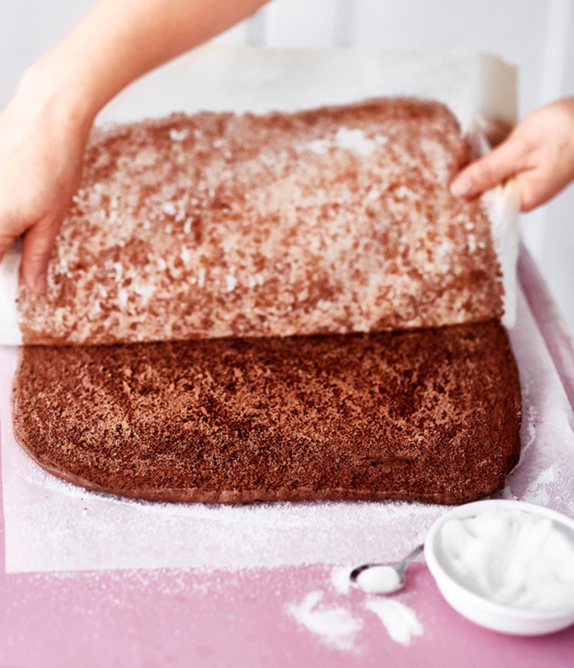 3. Ripottele sokeria kahdelle puhtaalle leivinpaperille. Kumoa kypsät torttulevyt niiden päälle ja irrota paistinpaperit. Laita levyille pyyhkeet ja kääri löyhille rullille jäähtymään.