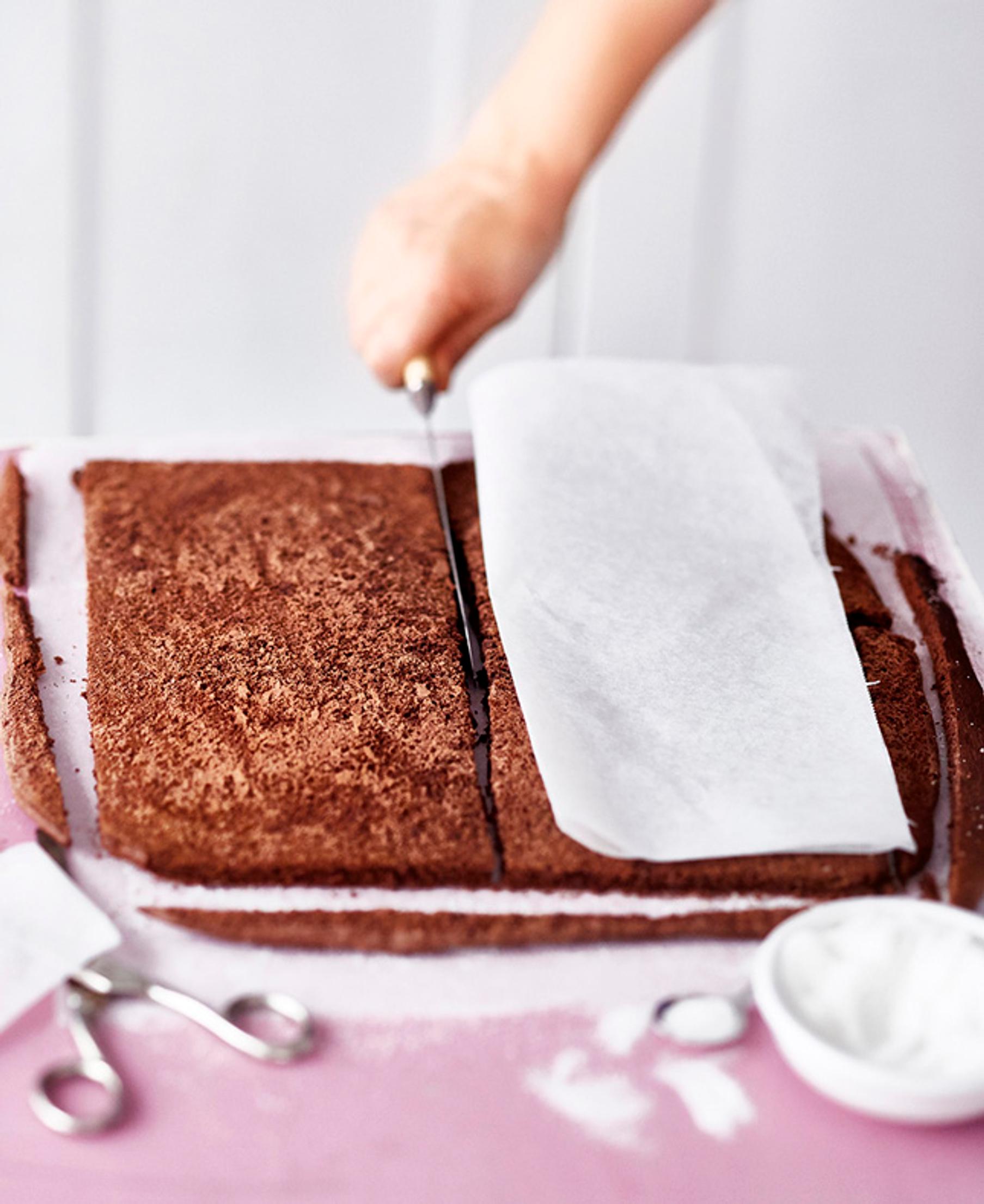 5. Avaa torttulevyt ja siisti reunat. Leikkaa levyt kahtia yhtä suuriin osiin. Avuksi käy viivotin tai voit leikata leivinpaperista ”kaavan”.