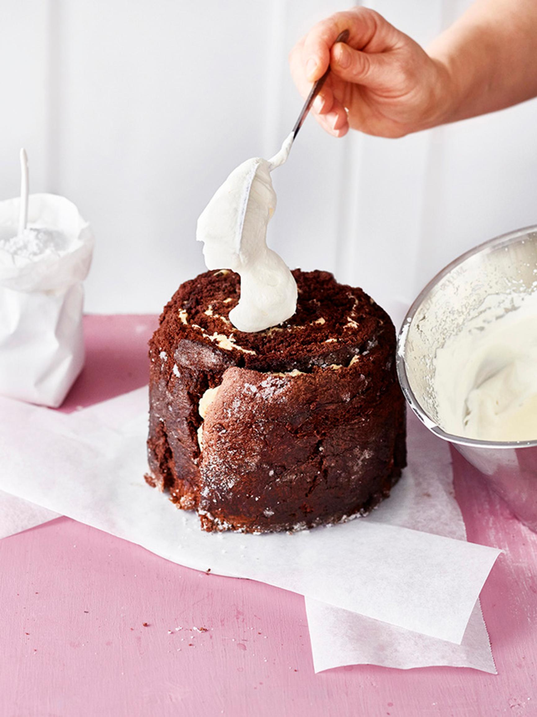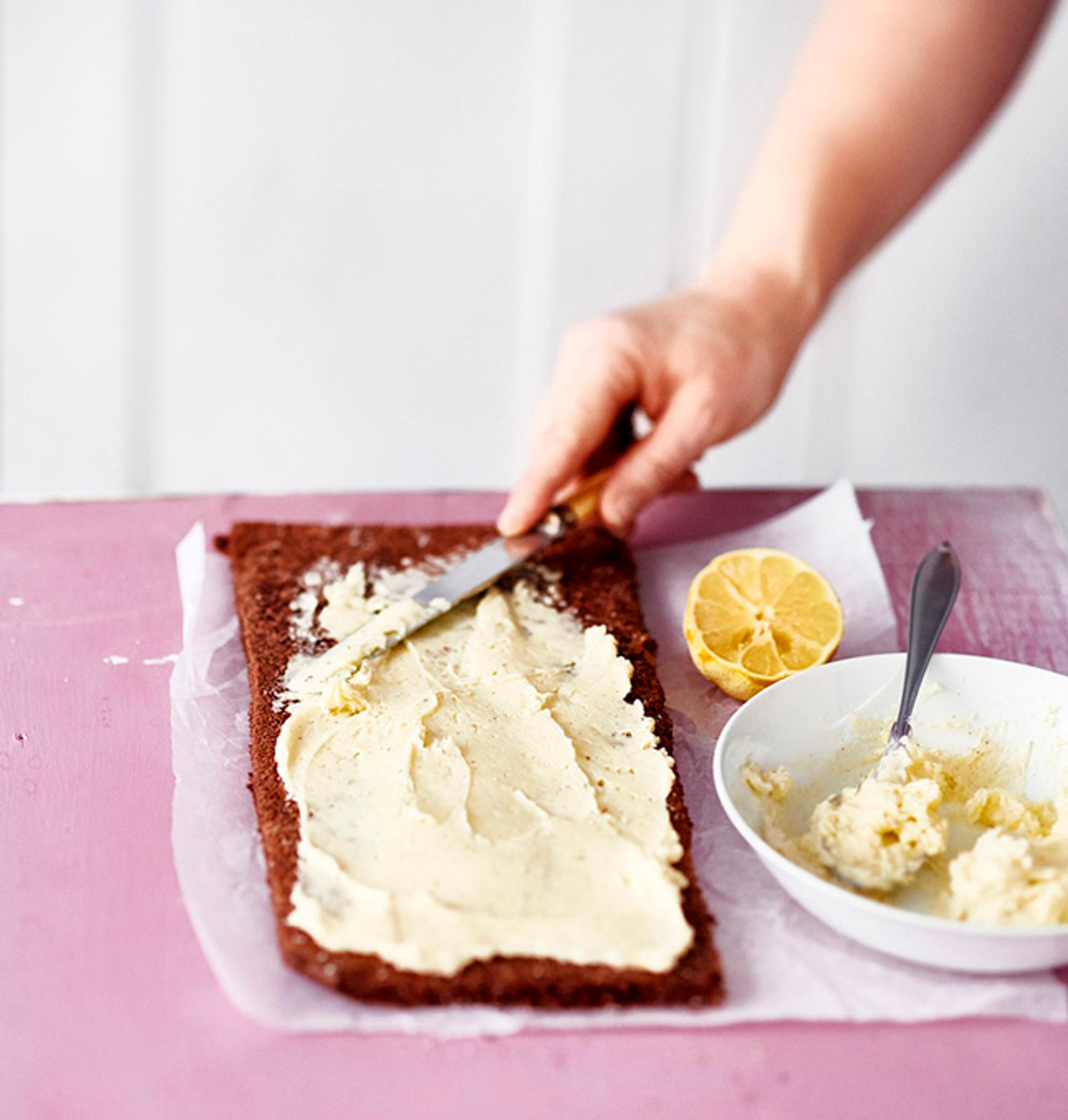 6. Levitä täyte pohjille. Laita kaikki neljä levyä peräkkäin. Kiedo niistä paksu kääretorttu. Älä hätäänny, jos torttu näyttää epätasaiselta tai pinta repeilleeltä.