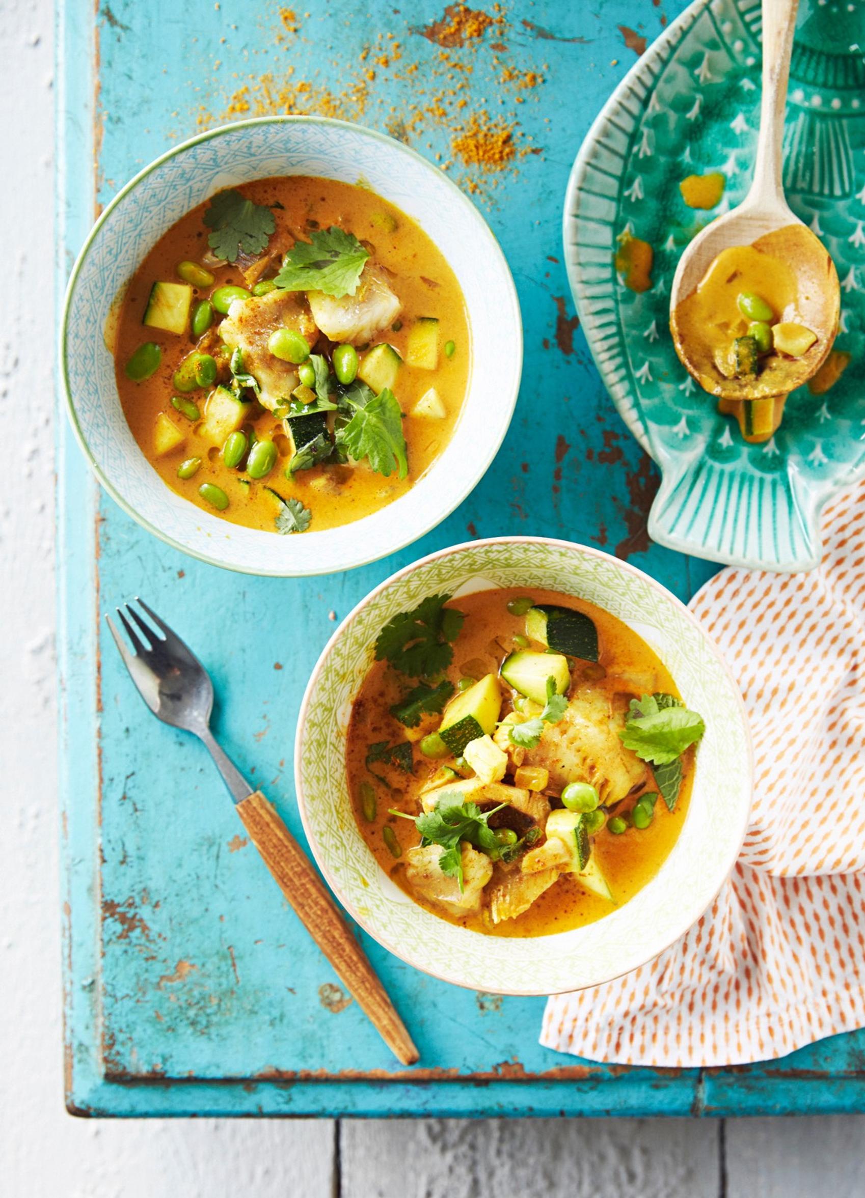 Pakastekalasta valmistettu kalacurry on todellinen arjen pelastaja! Intialaishenkinen herkku saa pehmeyttä kookoksesta ja rakennetta kesäkurpitsasta ja pavuista.