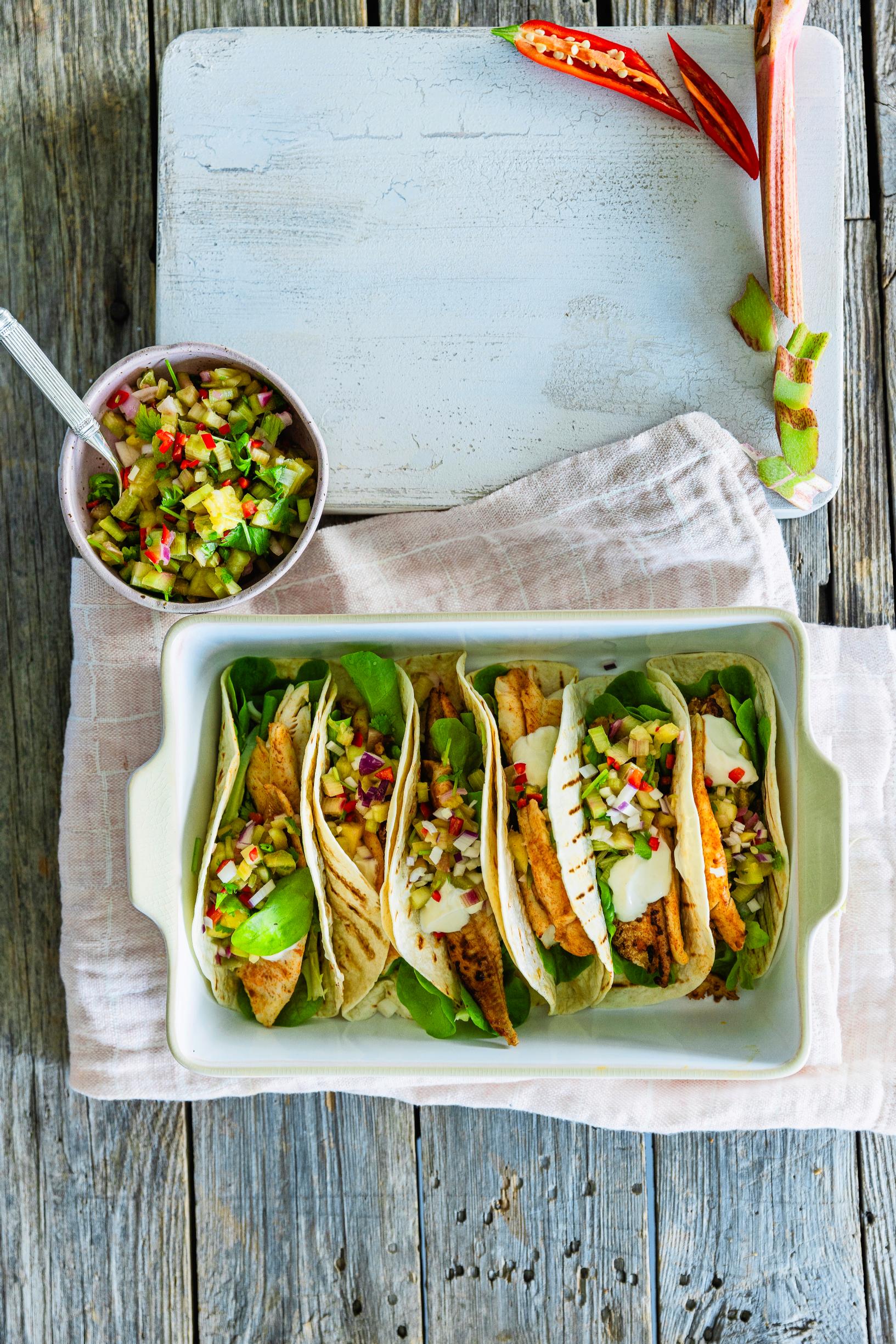Kesäinen herkkuruoka! Kalatacot herkutellaan sesongin hauskimman lisukkeen, raparperisalsan, kanssa