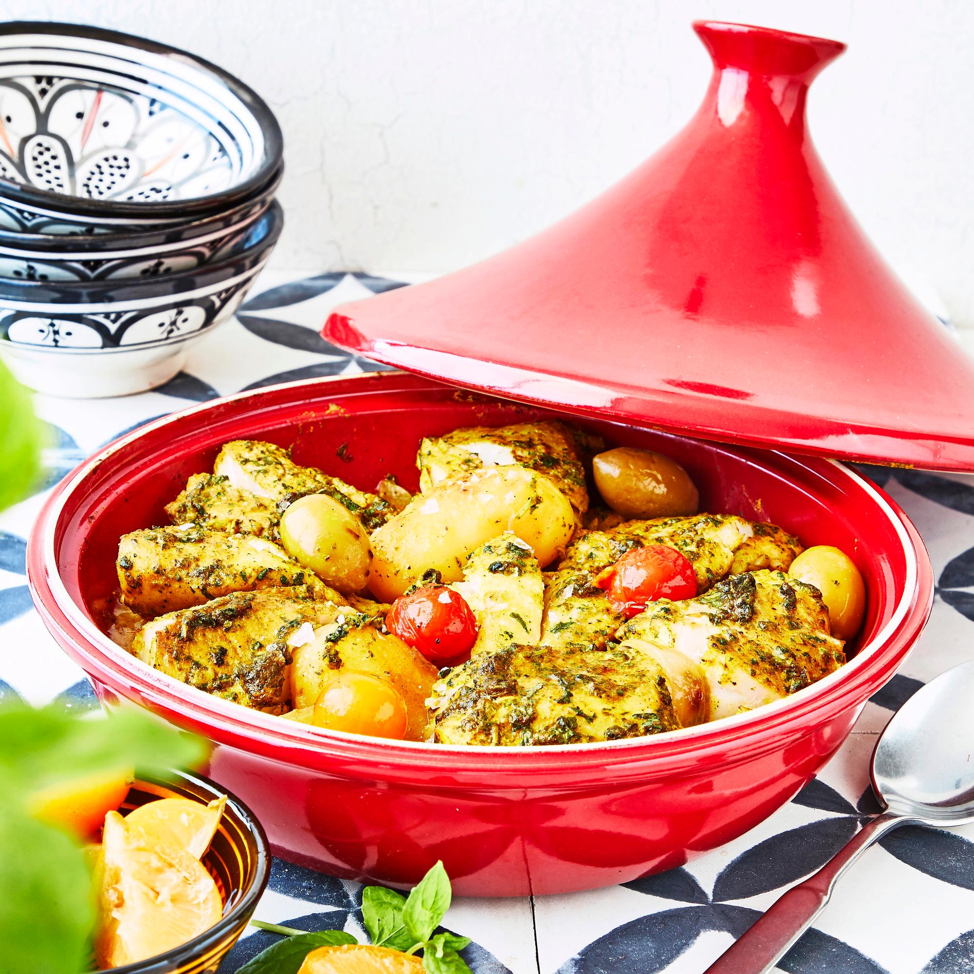 Kalatagine saa marokkolaista twistiä yrttisestä chermoula-kastikkeesta, oliiveista ja suolasitruunoista. Ruoan voi kypsentää myös tavallisessa uunivuoassa.