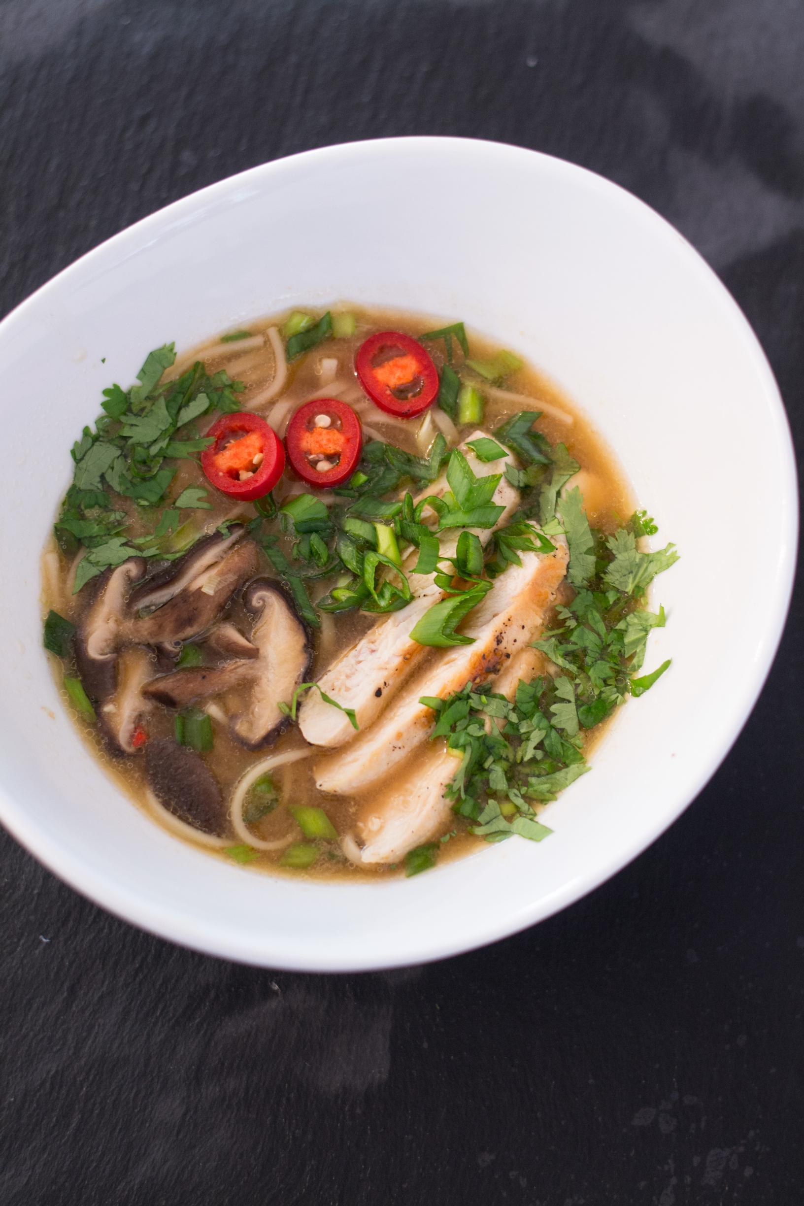 Jaa keitto kulhoihin ja asettele keiton pinnalle broileria sekä hienonnettua korianteria. Voit halutessasi lisätä keittoon myös sriracha -kastiketta tuomaan lisää potkua.