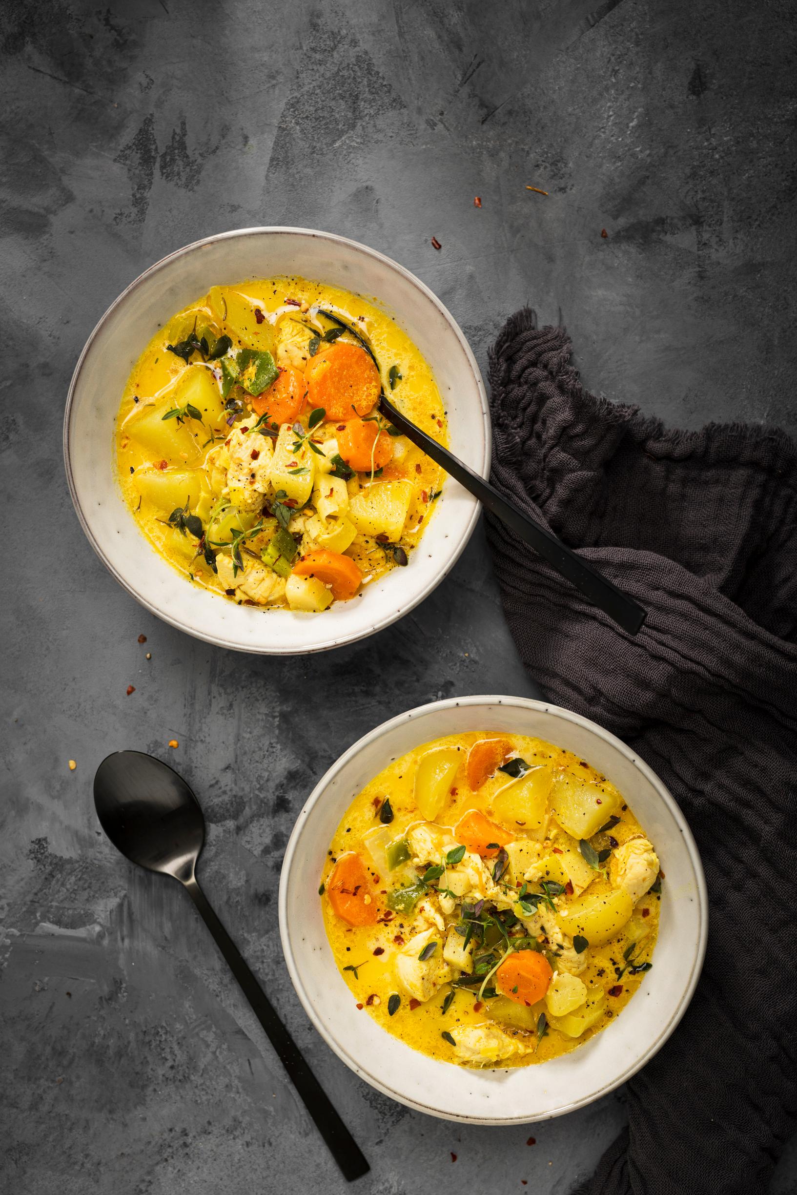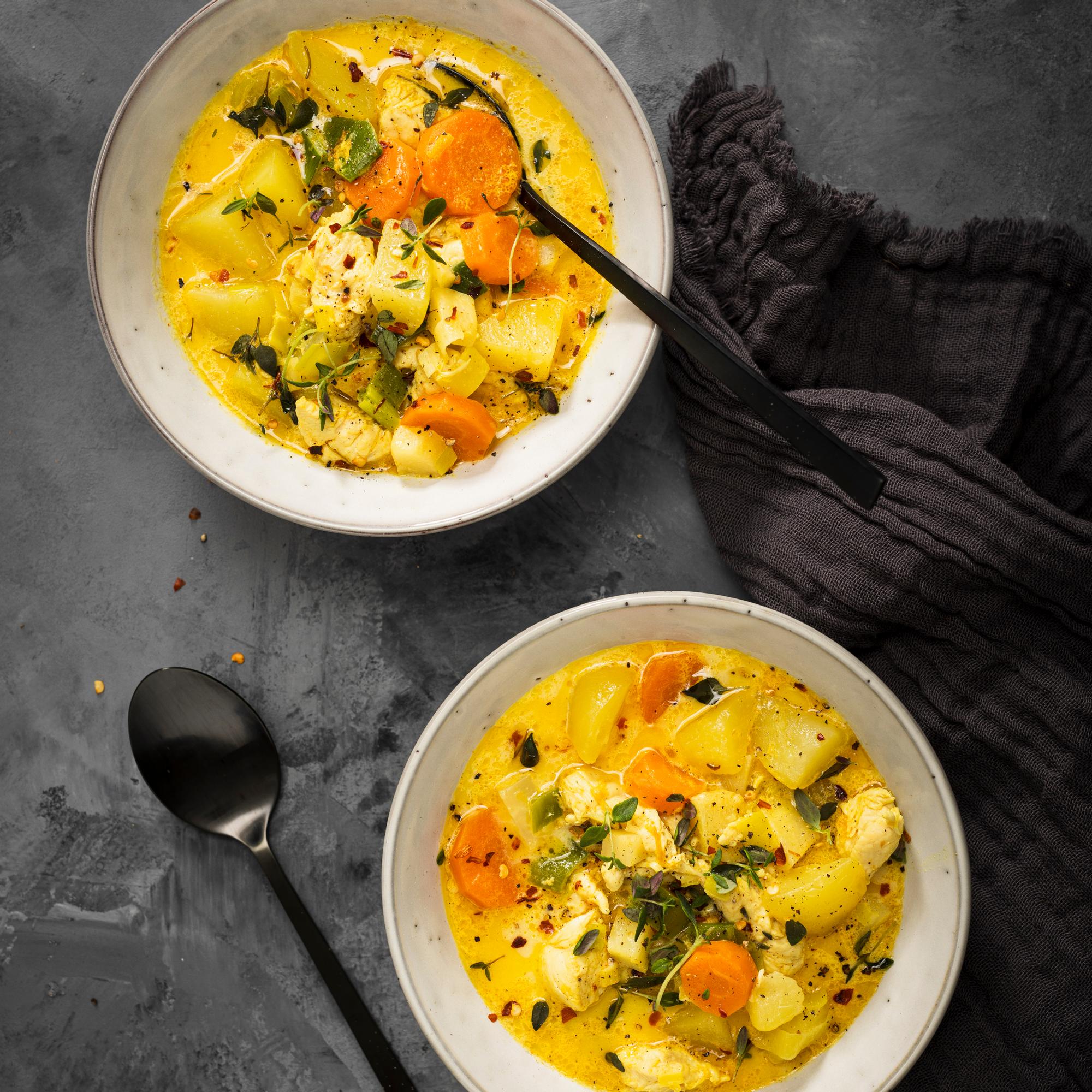 - Lisää vesi, kanafondi, kerma ja curry, paprika ja chilirouhe. Kuumenna kiehuvaksi ja keitä 15–20 minuuttia, kunnes perunat ja juurekset ovat kypsiä.