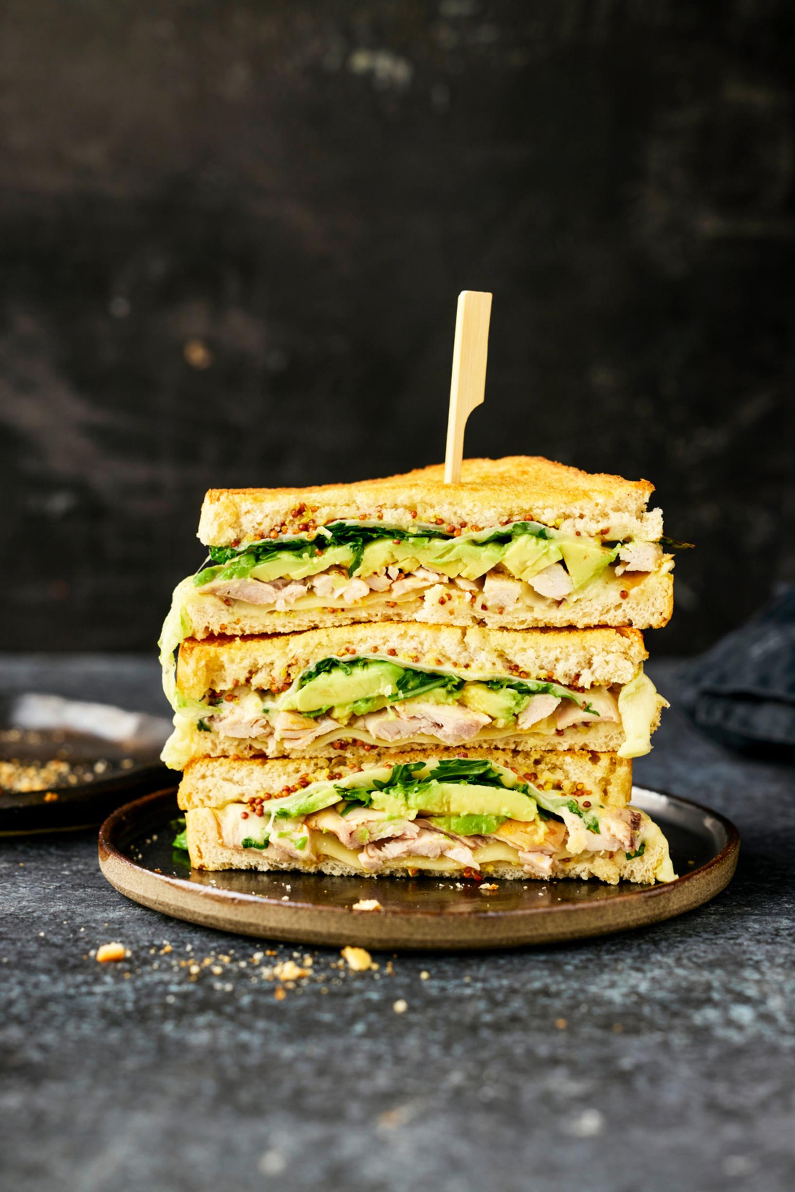 - Levitä avokadoviipaleet, grillattua broileria ja rucolaa kahdelle leivälle. Aseta päälle leipäviipaleet juustopuoli täytettä vasten. Voitele leivät voilla tai öljyllä.