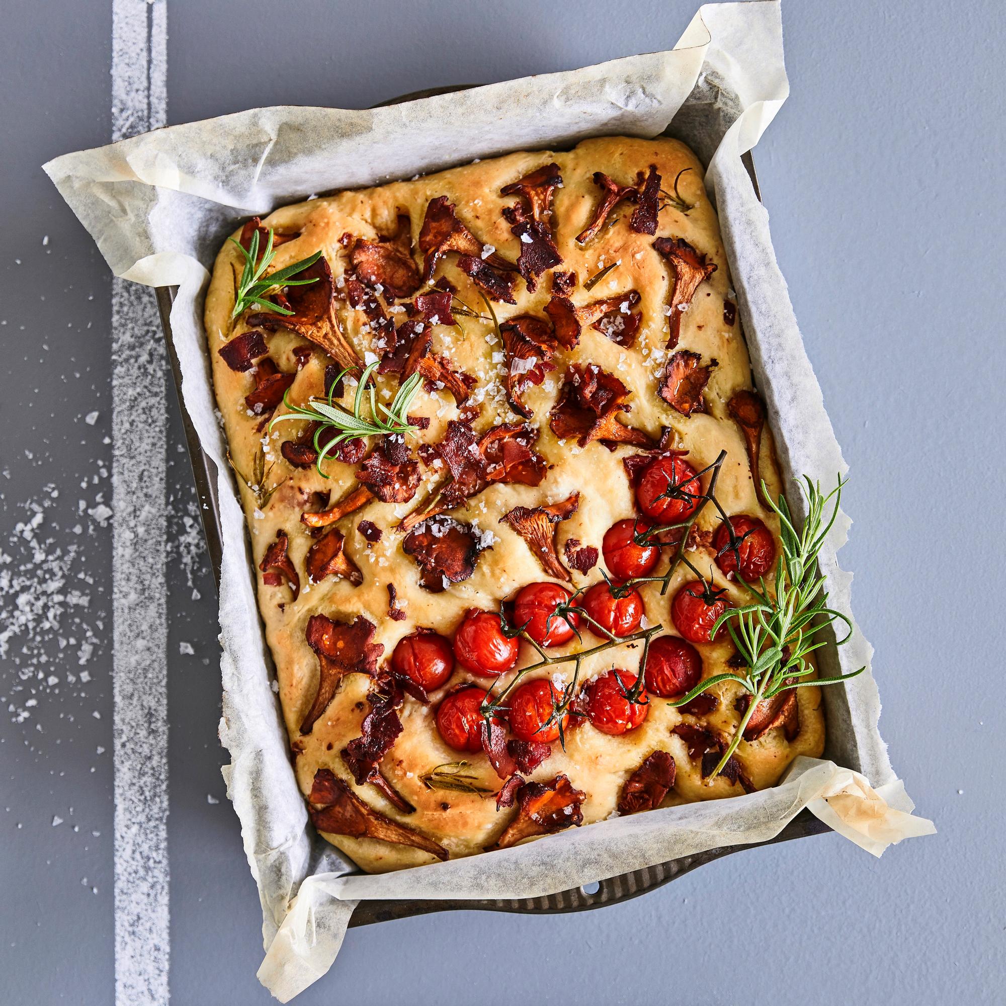 Kantarelli-pekonifocaccia – sienet, kirsikkatomaatit ja rapeat pekonimurut tekevät leivästä luksusta