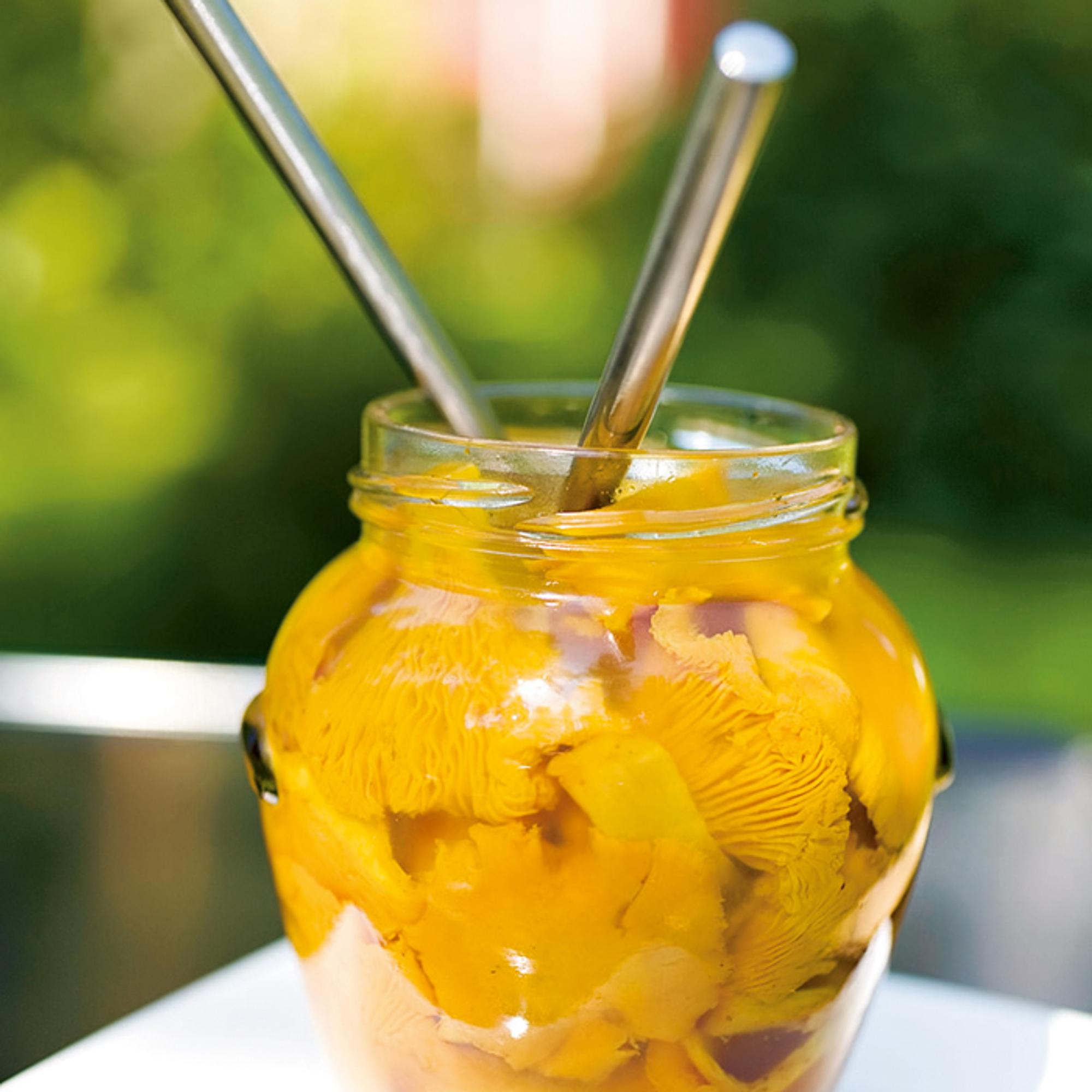 Lado sienet purkkeihin ja kaada kuuma liemi päälle. Jäähdytä kantarellipikkelssipurkit.