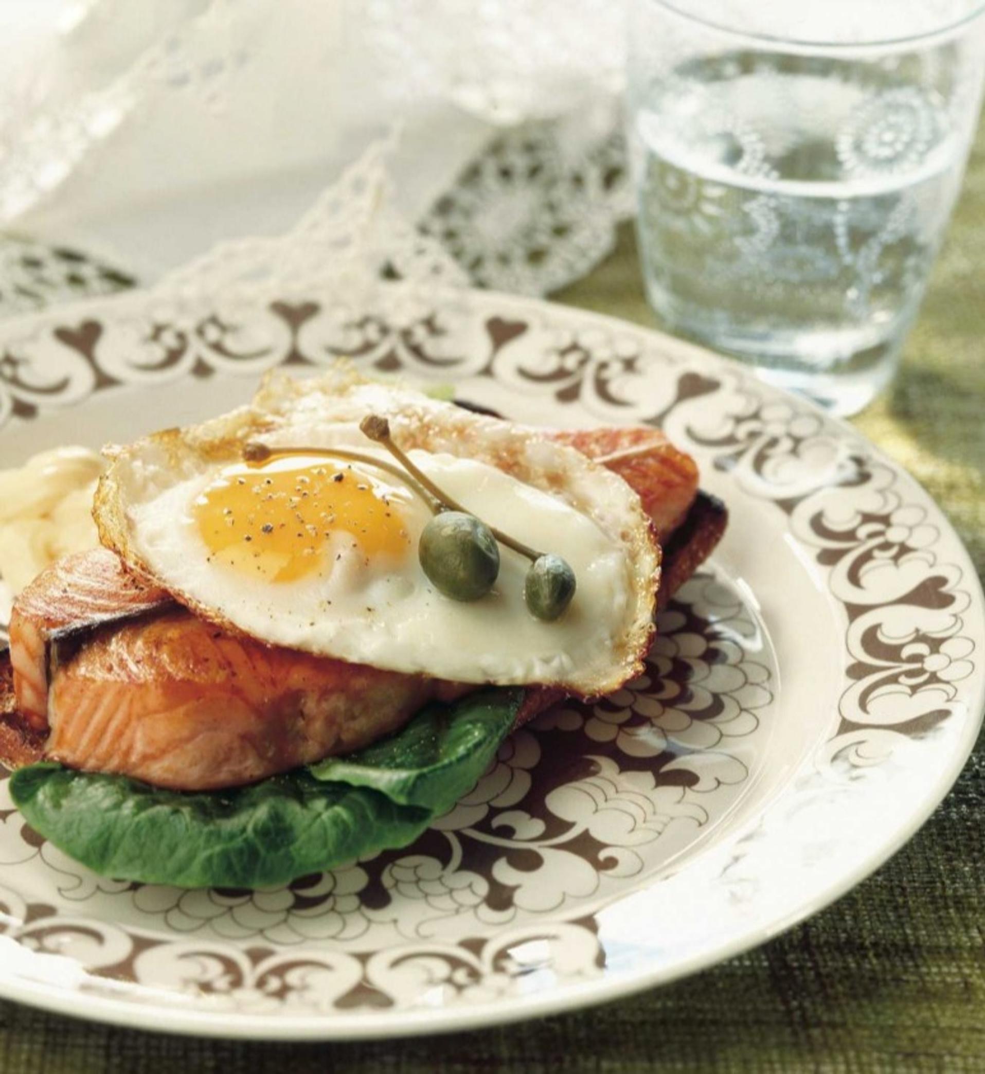 Kokoa kappelileivät lämmitetyille lautasille. Asettele leipien päälle salaatinlehdet, kala ja päällimmäiseksi muna. Rouhi pintaan vielä hiukan pippuria, suolaa ja koristele muutamalla kapriksella.