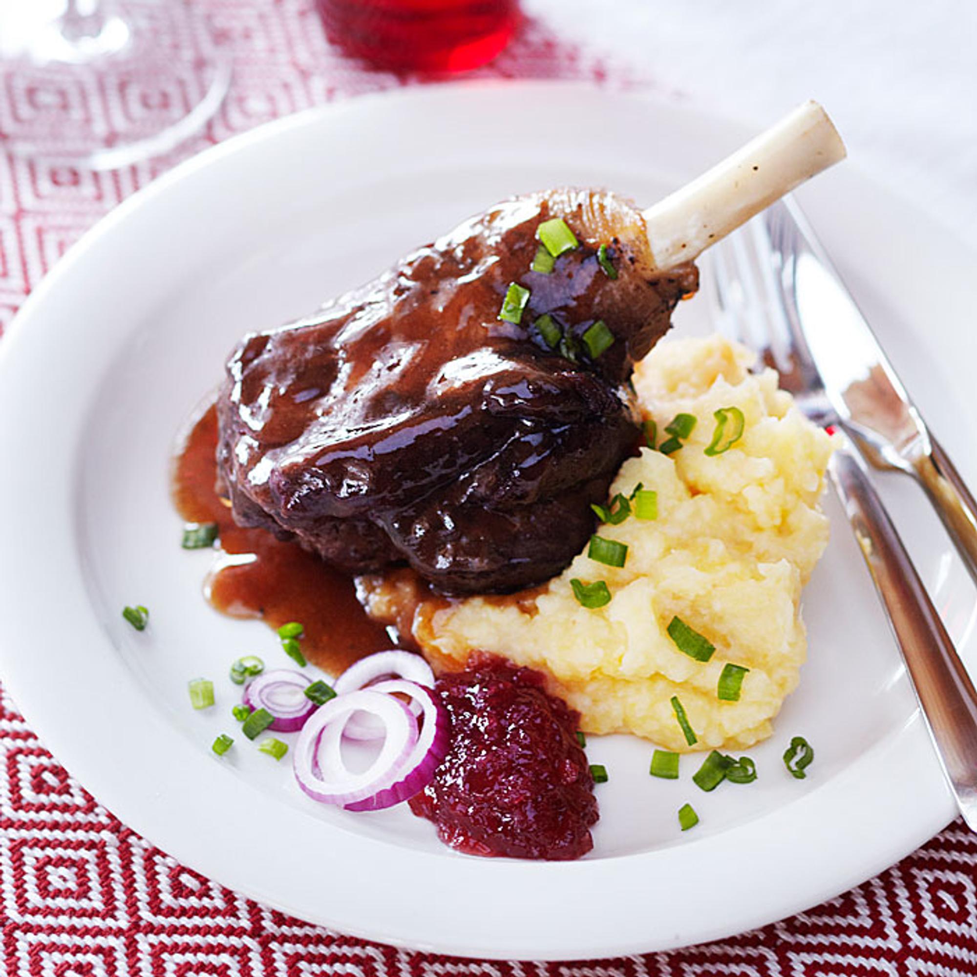 Lisänä maistuu juuressose ja puolukka-punasipulihyytelö.