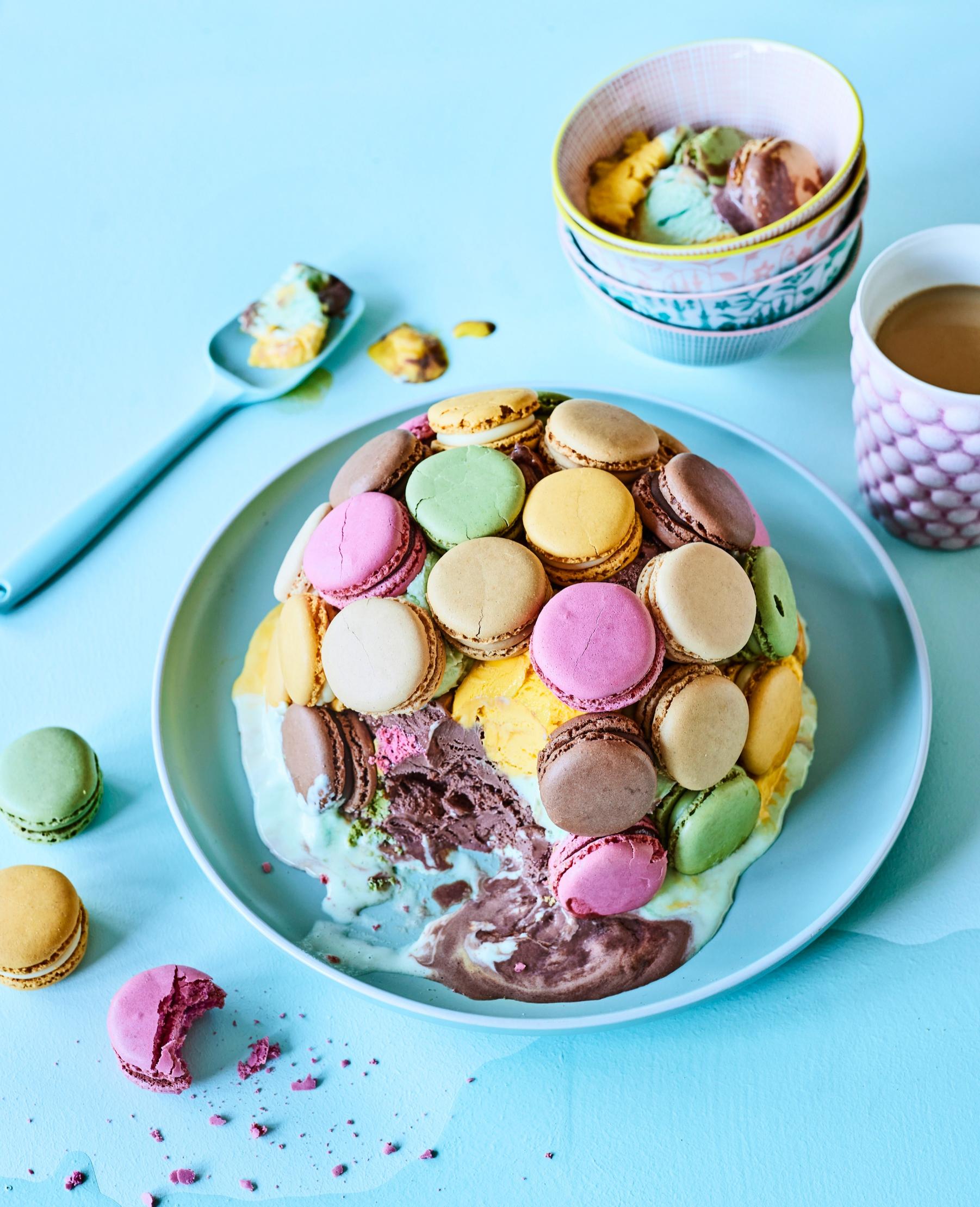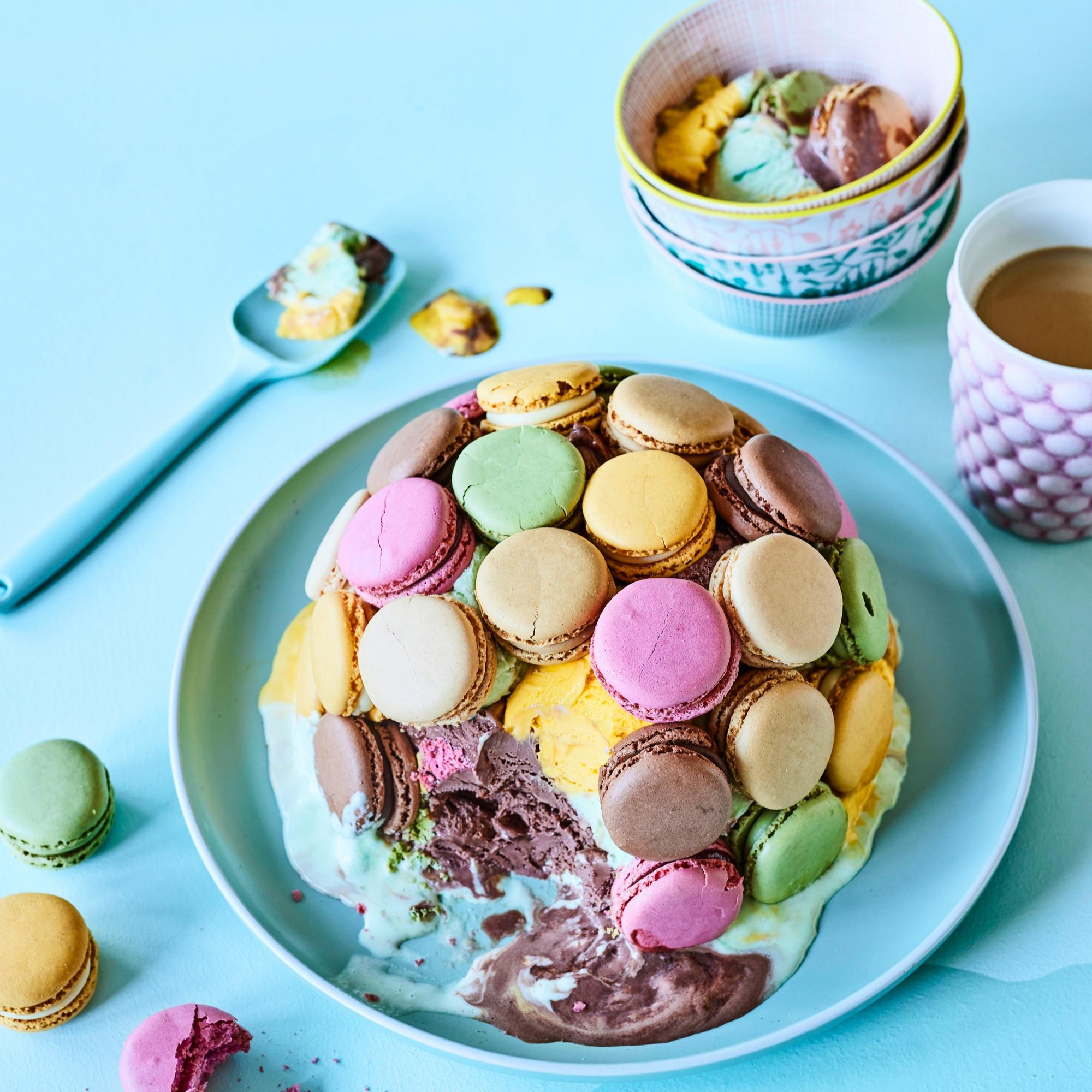Kokoa niin lapsille kuin aikuisillekin maistuva helppo jäätelökakku charlotte russe -kakun tapaan, mutta käytä pakastealtaan valmiita macaron-leivoksia ja kolmea erimakuista jäätelöä. Iloisen värikäs karnevaalikakku vaatii vain vartin aikaasi!